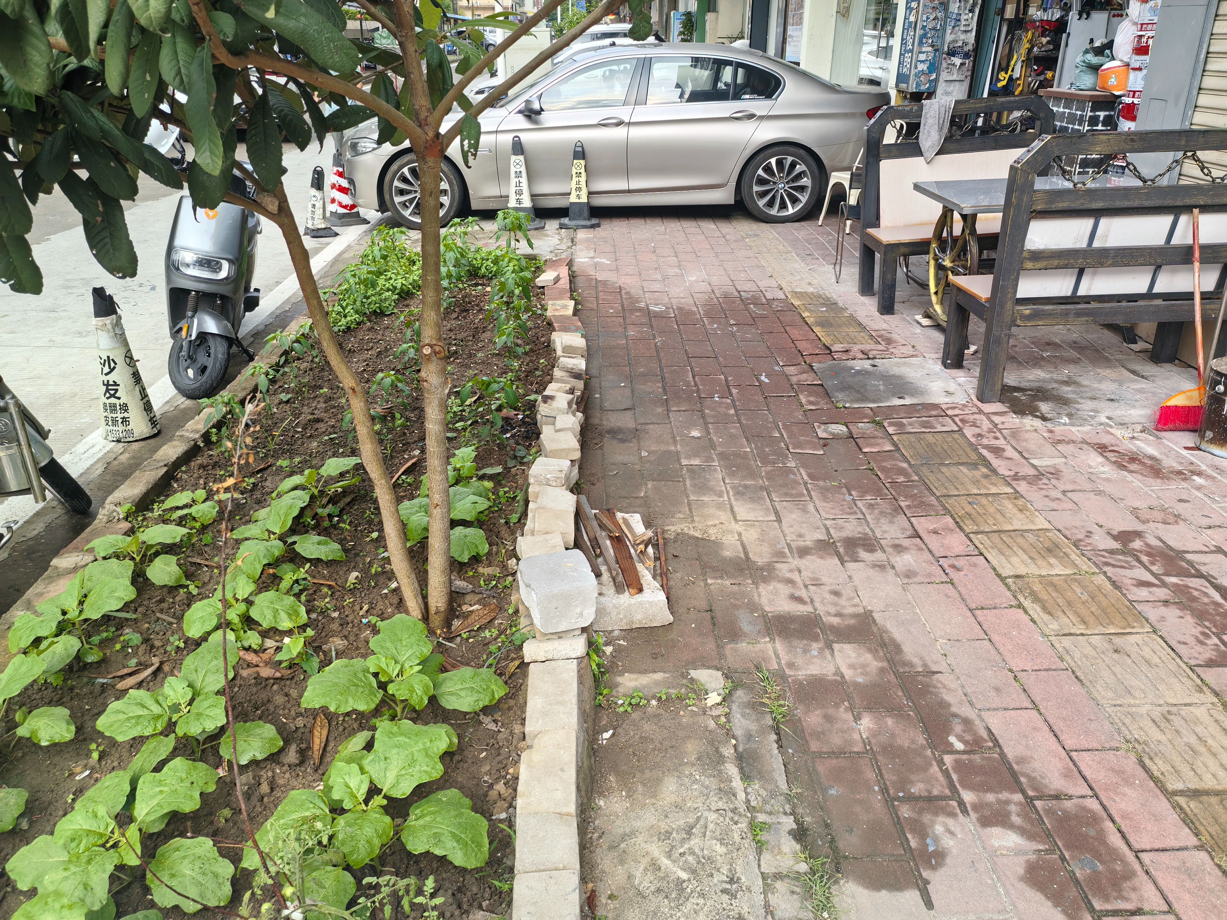 锦绣沙溪会都苑一侧乱象更甚:规划好的人行道和盲道被私家车、电动车完全堵死;部分居民竟擅自在人行道开辟菜园,种植了叶菜;部分路段被商家霸占,安装了地锁,设置了旧轮胎、雪糕桶、水泥桩,严重破坏市容环境,人行道被切断了。