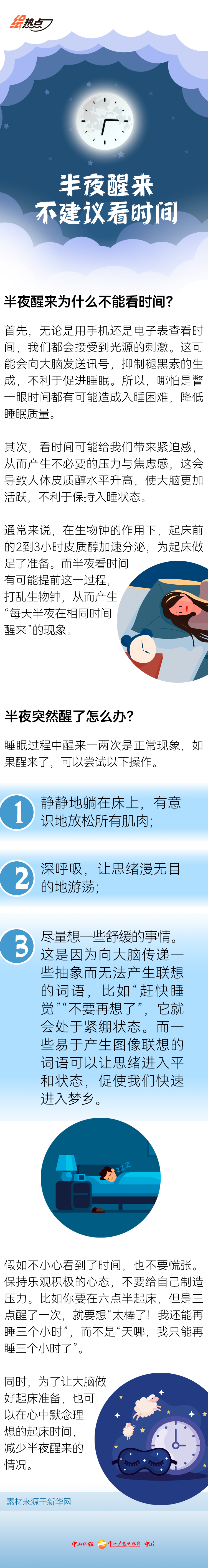 你有没有过这样的经历?夜里醒来,拿起手机看眼时间,再缩进被窝睡觉,然后发现,接下来几天会在同一时间醒来。最近“半夜醒来千万不要看时间”冲上热搜,引发网友热议。半夜醒来为什么不能看时间?突然醒了应该怎么做?一图读懂。