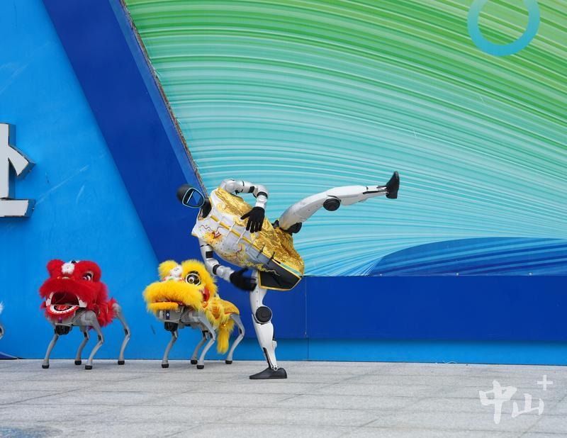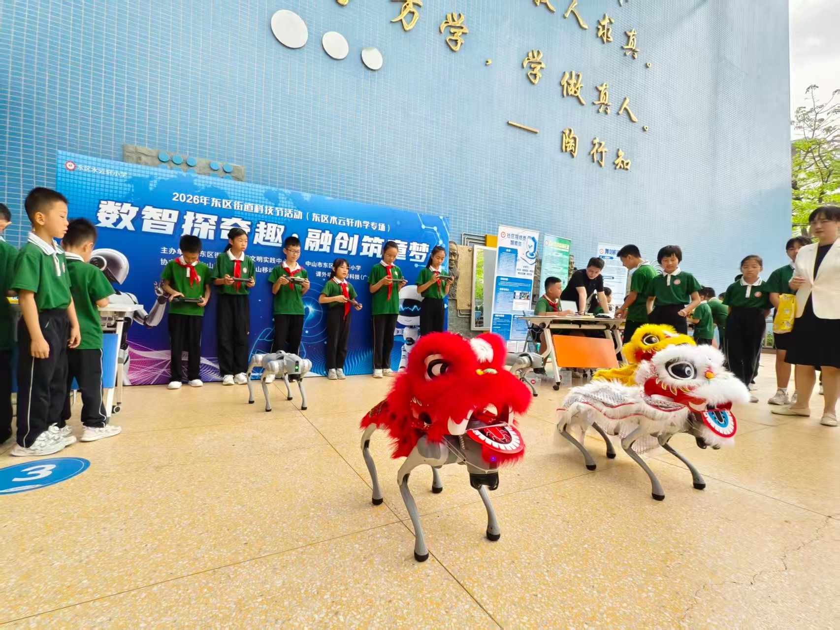 随后,身着中式服饰的机器人闪亮登场,握手、问好、跳舞、武术表演一气呵成,三只穿戴舞狮服饰的机器狗时而向孩子们招手,时而抬腿跳舞,萌态十足,瞬间将现场氛围推向高潮,同学们对智能科技大开眼界,纷纷渴望和它来一场亲密接触。