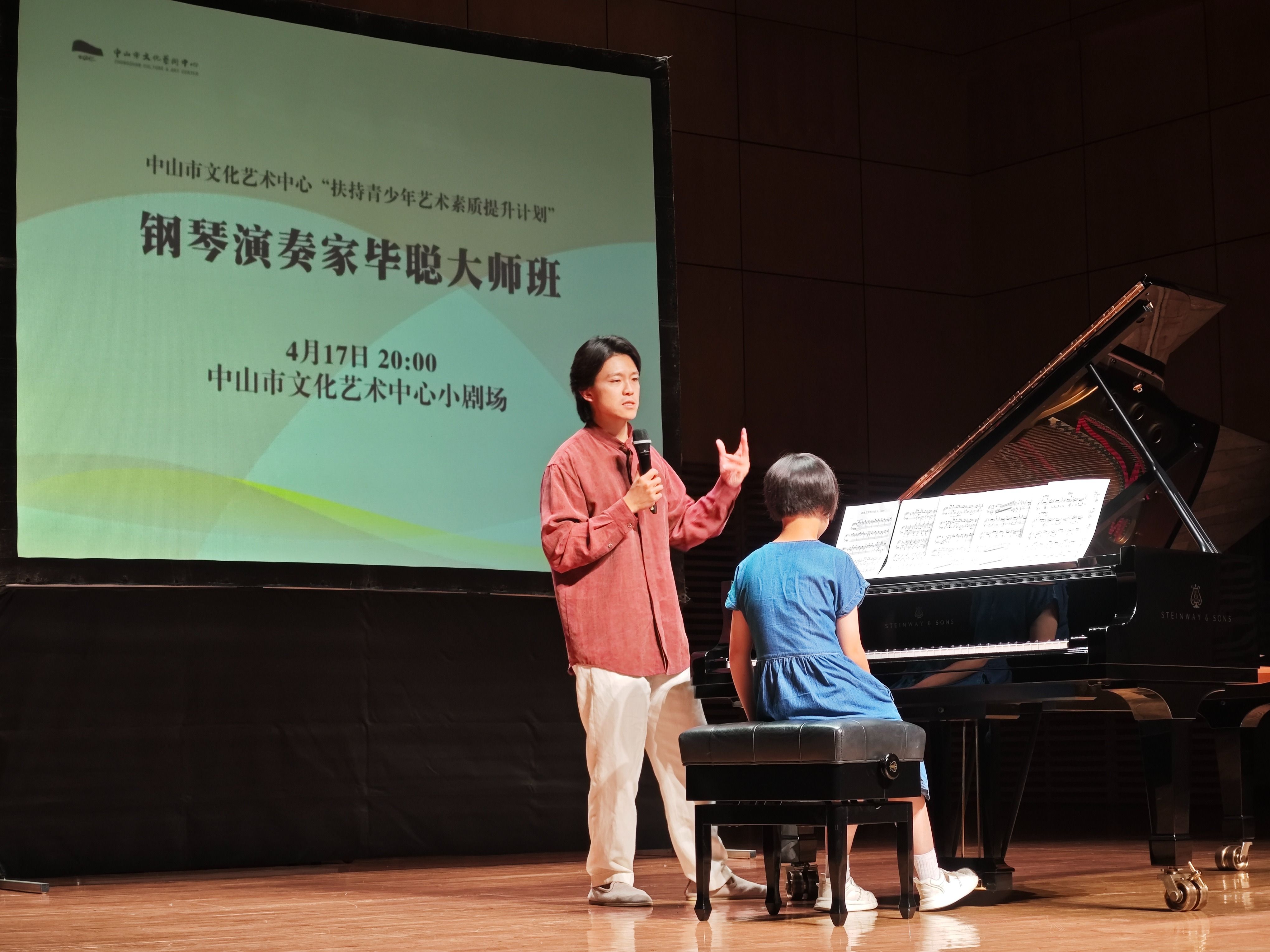 毕聪不仅用双手将中国音乐新作带往更广阔的舞台,也在引领着众多琴童更深入地感受世界的音乐。4月17日晚,在中山市文化艺术中心举办的大师班上,毕聪一一指点三位依次登台的琴童,足有两个小时。他不厌其烦地调整他们的触键角度、手腕高度,反复示范如何让音色从“敲”变成“唱”。一个女孩弹李斯特的《小狩猎》时声音偏硬,毕聪把她的手腕轻轻提起,教她感受快速离键的抓力感——“把力量瞬间收回,留下干净的声音。”在他的悉心指导下,孩子们的演奏愈发流畅。