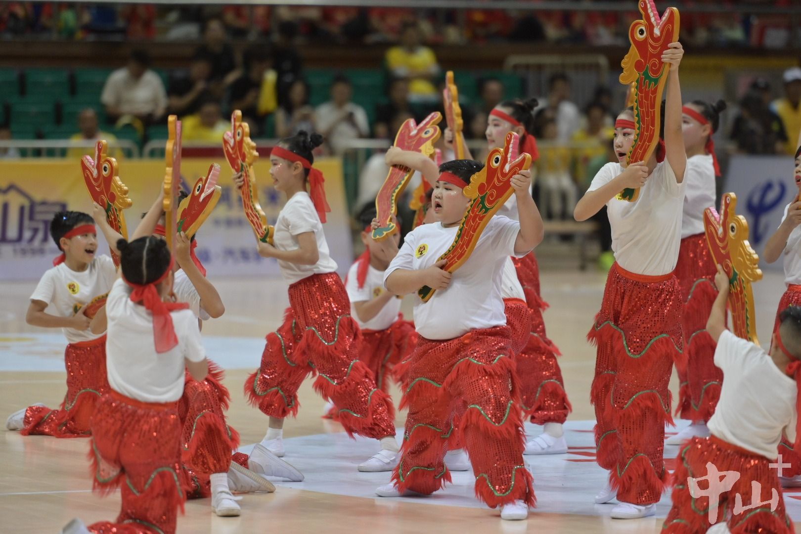 赛前,首个登场的非遗舞蹈《醉龙擎风》一亮相便吸引了全场目光。来自烟洲小学的28名“小龙人”头扎红色头巾,手持精致小红龙,将国家级非物质文化遗产——中山醉龙舞的刚劲与灵动展现得淋漓尽致。这支表演队伍覆盖了二年级至六年级,其中不少孩子是“新中山人”。