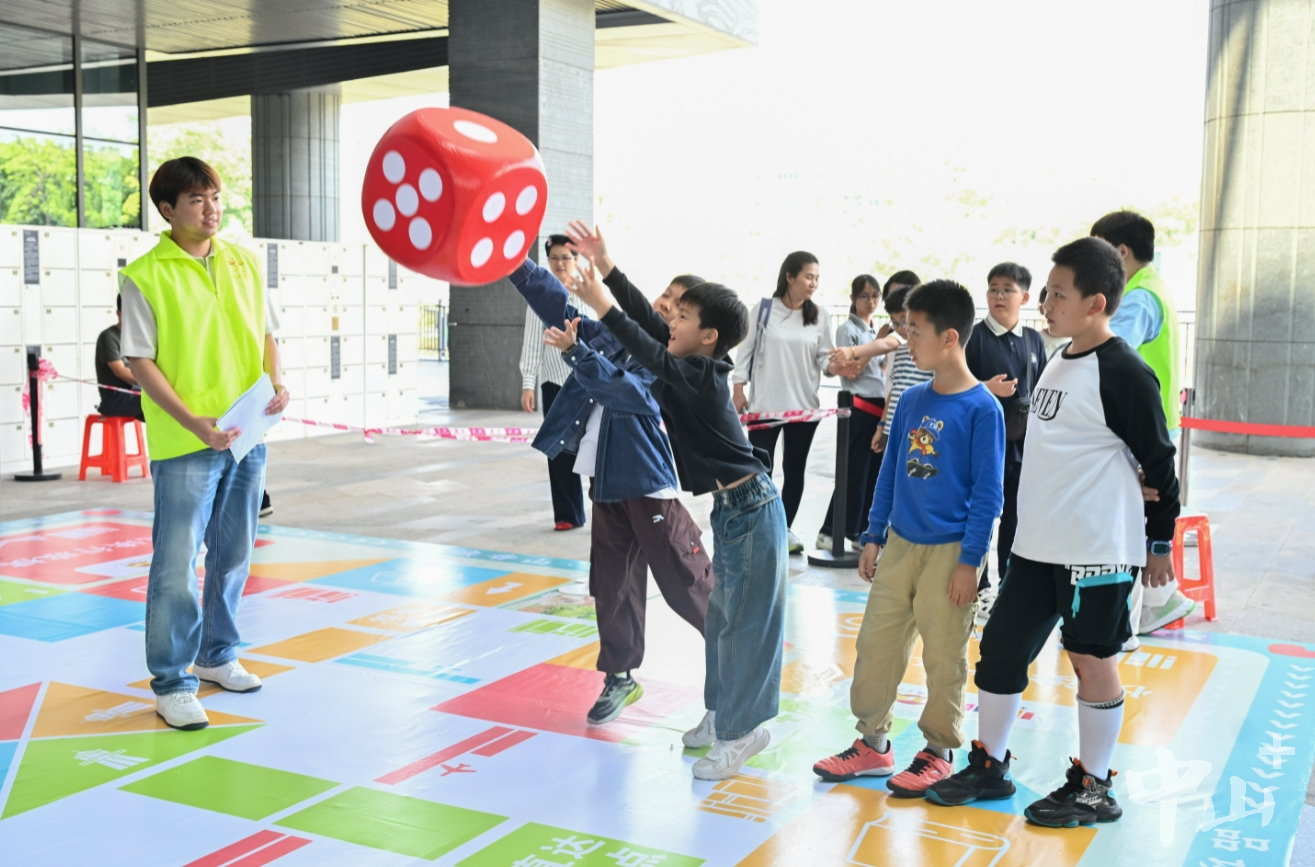 当天,“悦读行旅棋互动”活动首次亮相“中山读书月”主题活动。在现场,类似“飞行棋”的颜色缤纷的地面棋盘和骰子,吸引了孩子和家长们的目光。小朋友们纷纷排队,挑战起这个项目。