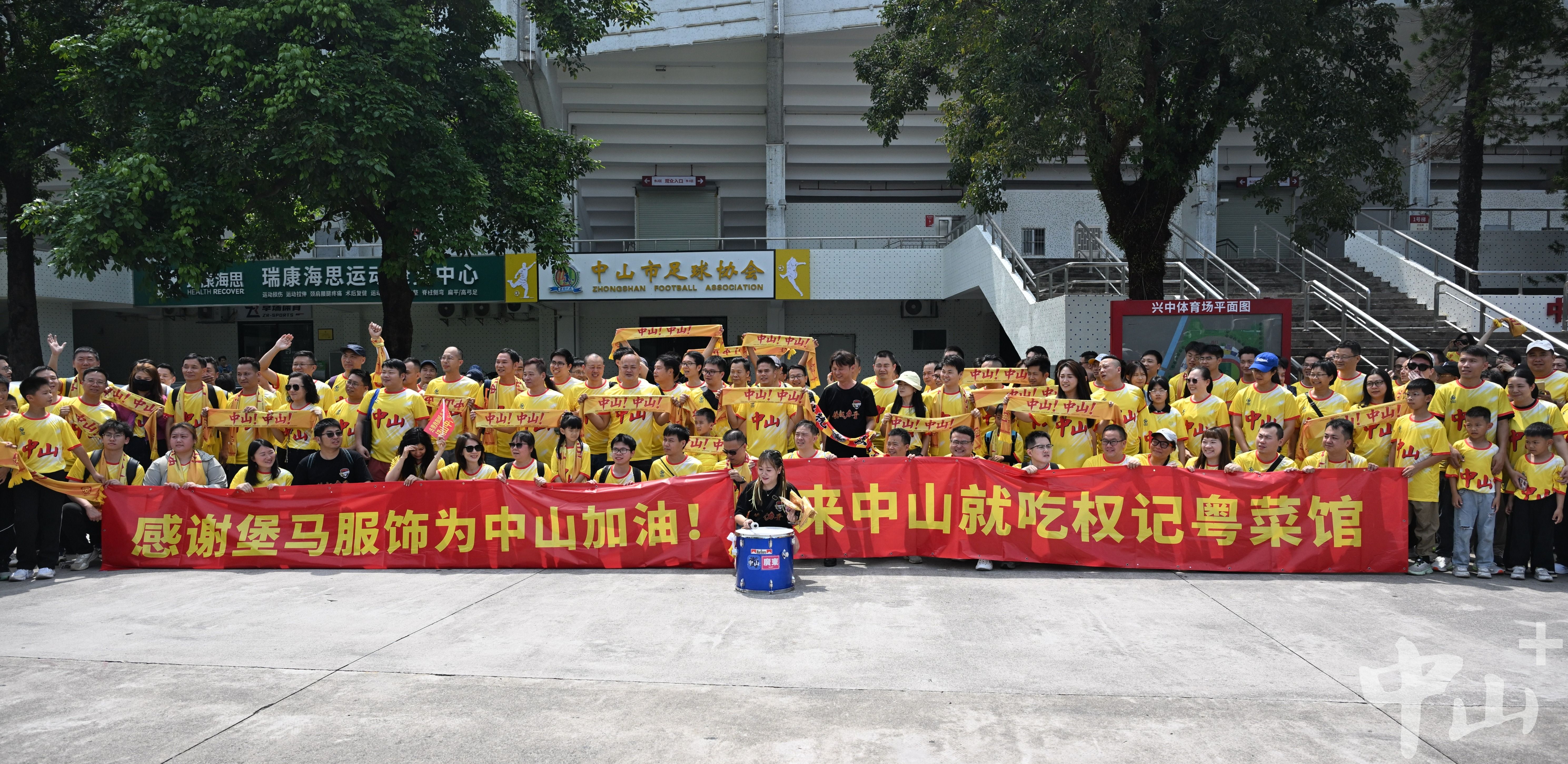4月26日14时,中山兴中体育场东门前广场人声鼎沸、热血涌动,中山球迷联盟集结近300名球迷在此举行出征仪式。球迷们随后乘车前往肇庆新区体育中心足球场,为今晚19时30分中山队粤超首战、客场对阵肇庆队的赛事呐喊助威。