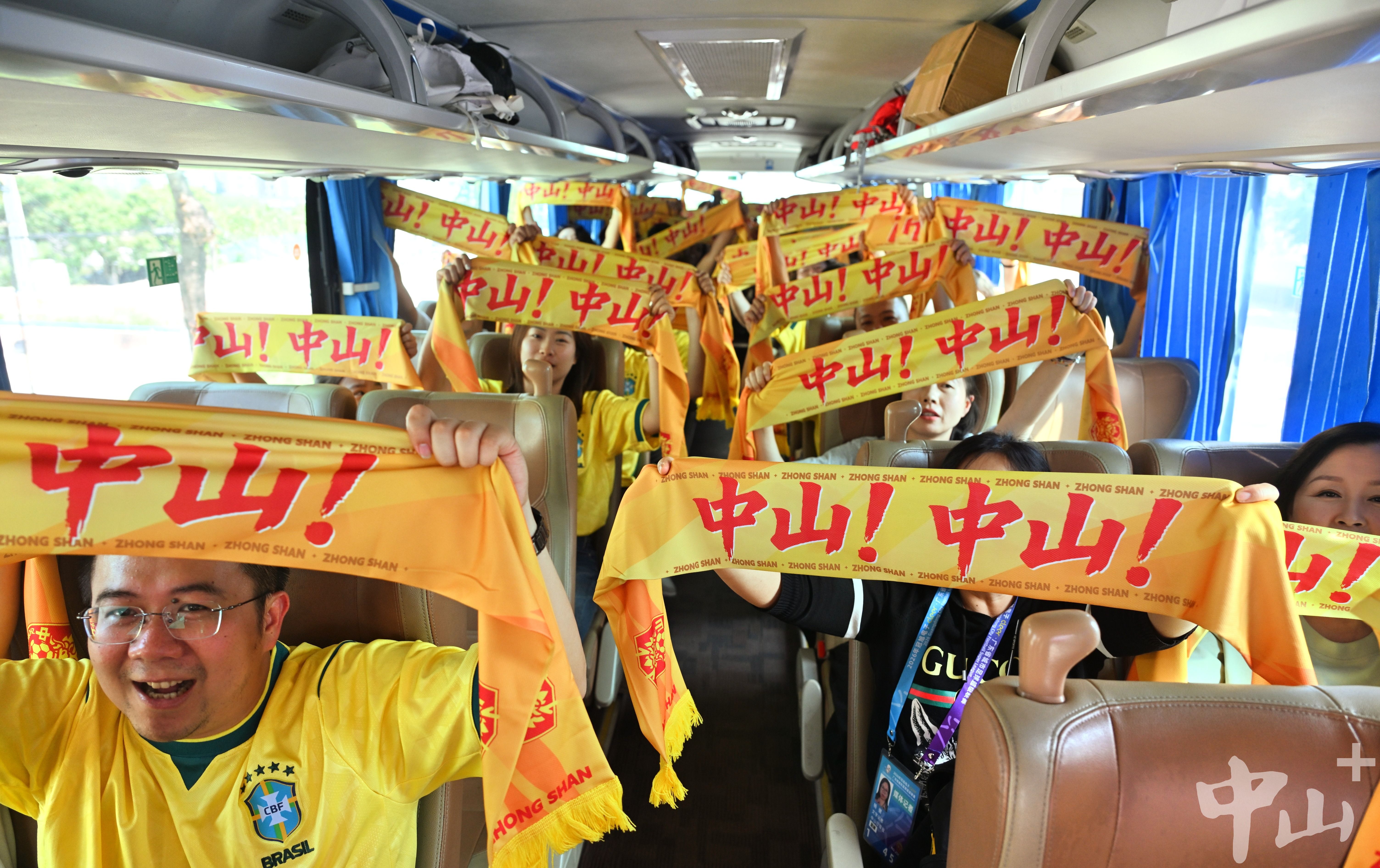 记者现场看到,出发前球迷们身着统一服装,齐声喊出“越T越强,敢战敢狂”的统一助威口号,铿锵有力的呐喊声回荡在体育场上空,瞬间点燃了热血出征的氛围。此外,球迷们自发设计多款应援物料,携带大鼓、大旗、横幅、彩带等装备,用精心准备的细节,彰显对中山队的支持与期盼。