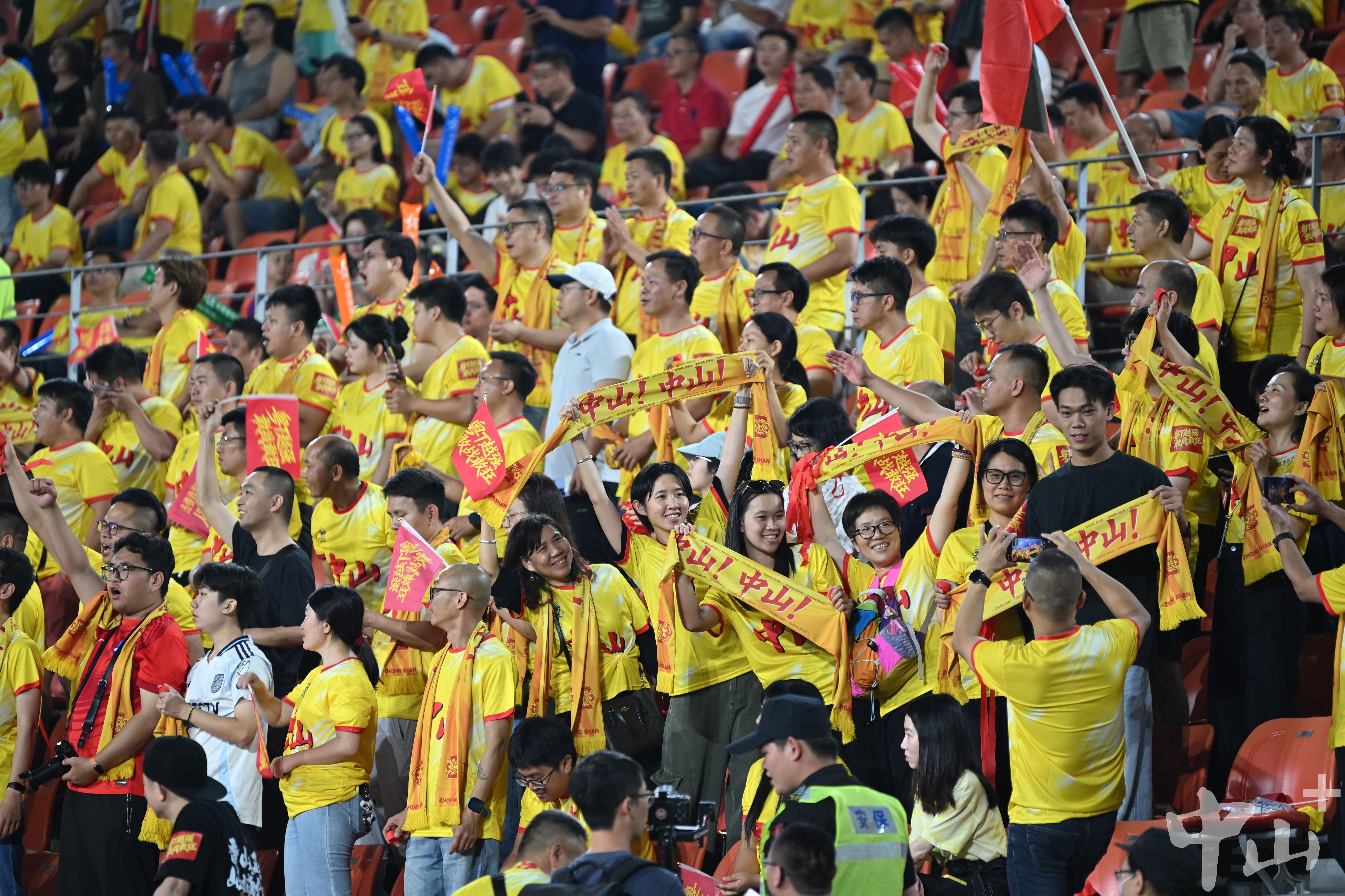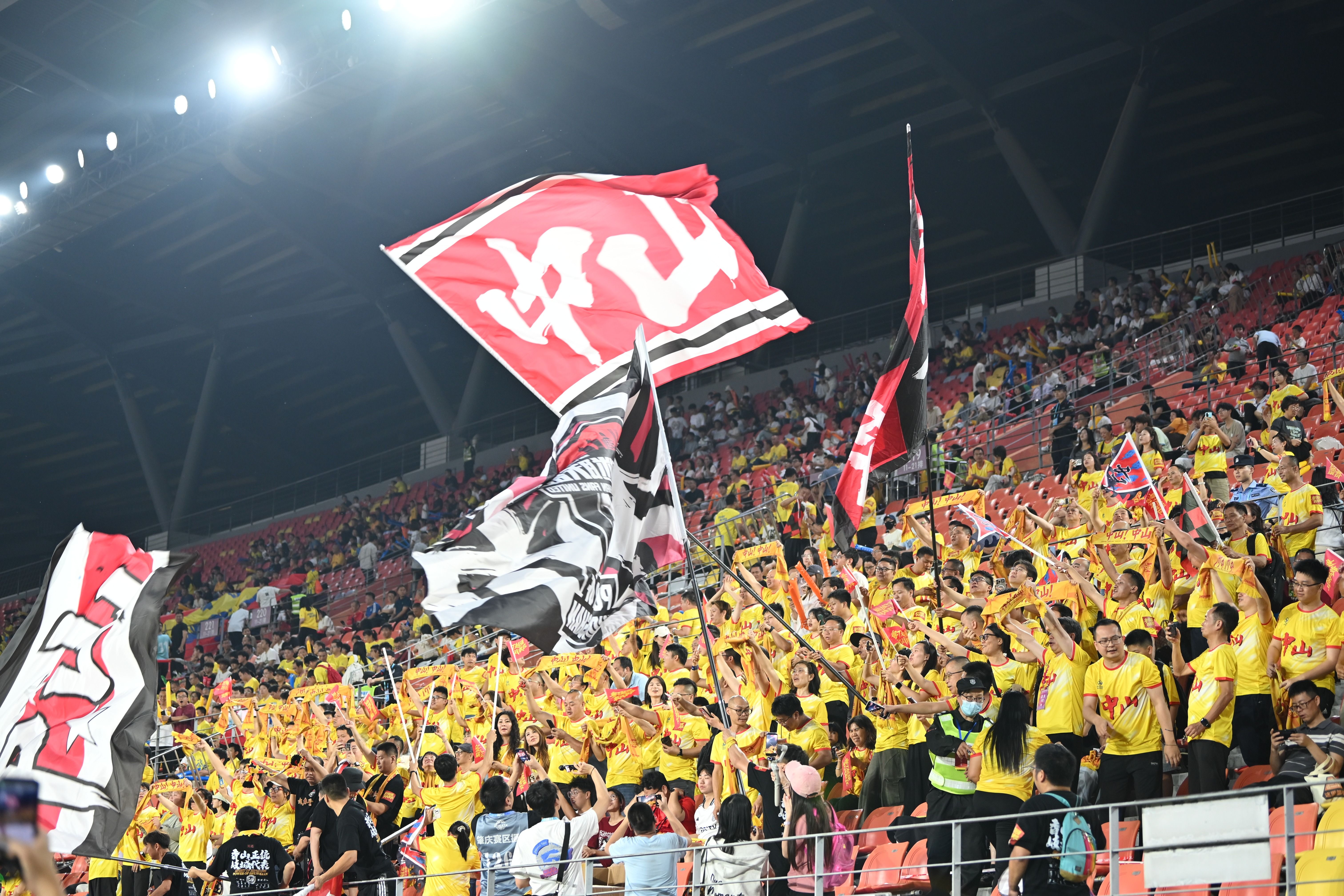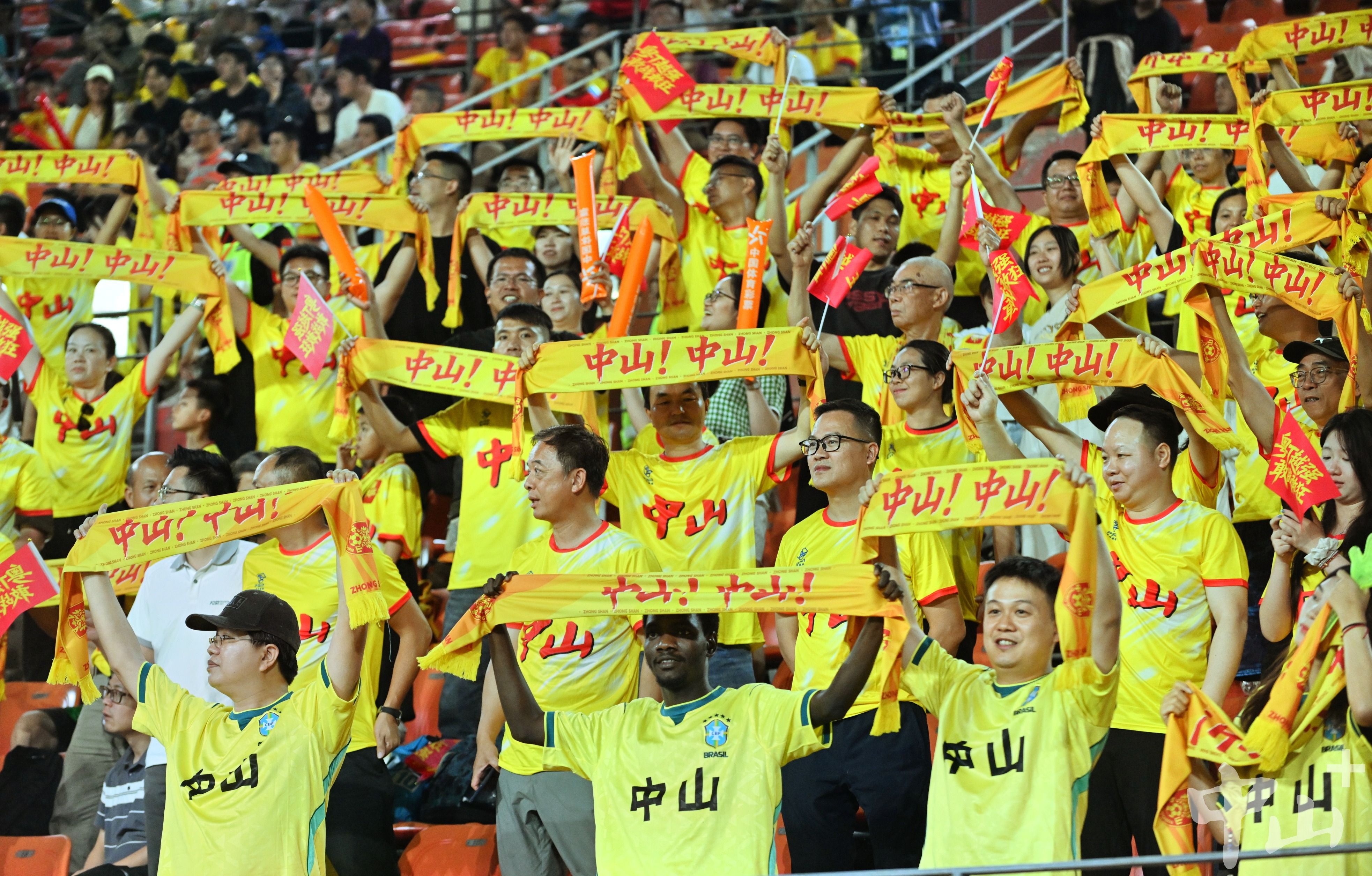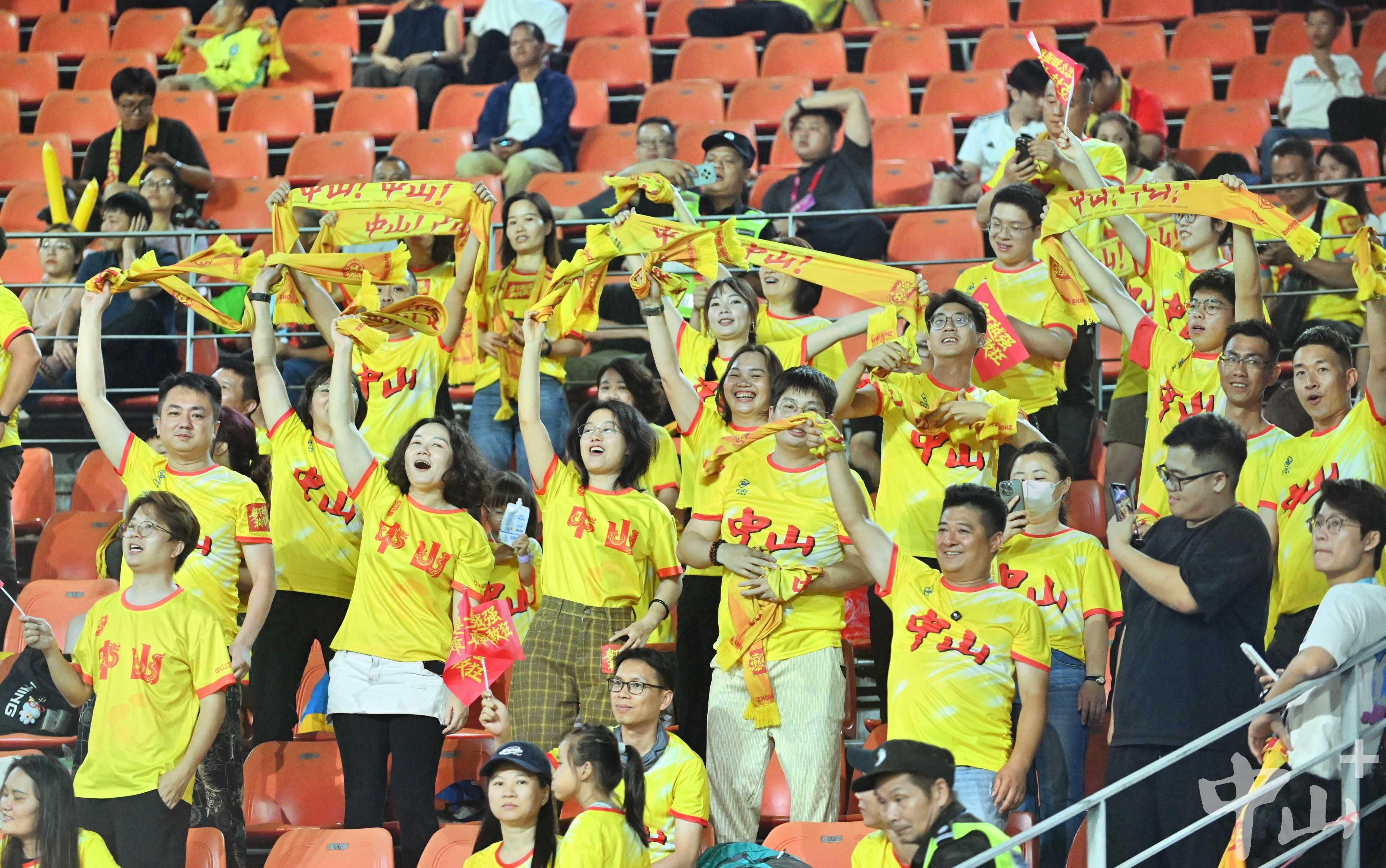 4月26日晚,粤超首轮,中山队在肇庆新区体育中心客场挑战肇庆队。绿茵场上,双方球员你来我往互不相让;球场之外,一场满是“硝烟”的比拼同样在上演。除了肇庆主场球迷外,统一身着黄色应援T恤的超500名中山球迷火力全开,高举印有“中山,粤T越强,敢战敢狂”“中山队,加油”的旗帜和标语,用整齐嘹亮的呐喊,为客场作战的中山队加油助威。