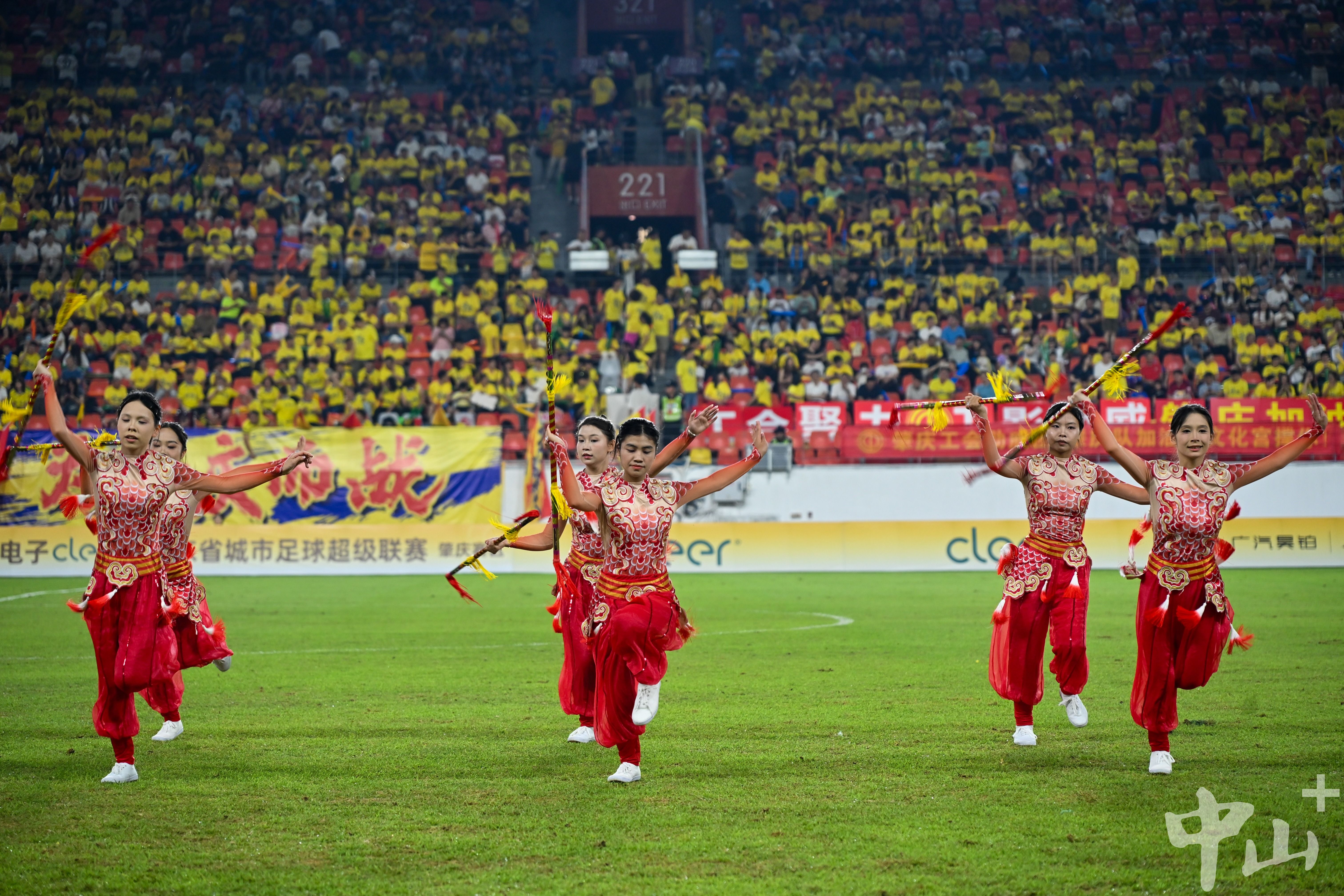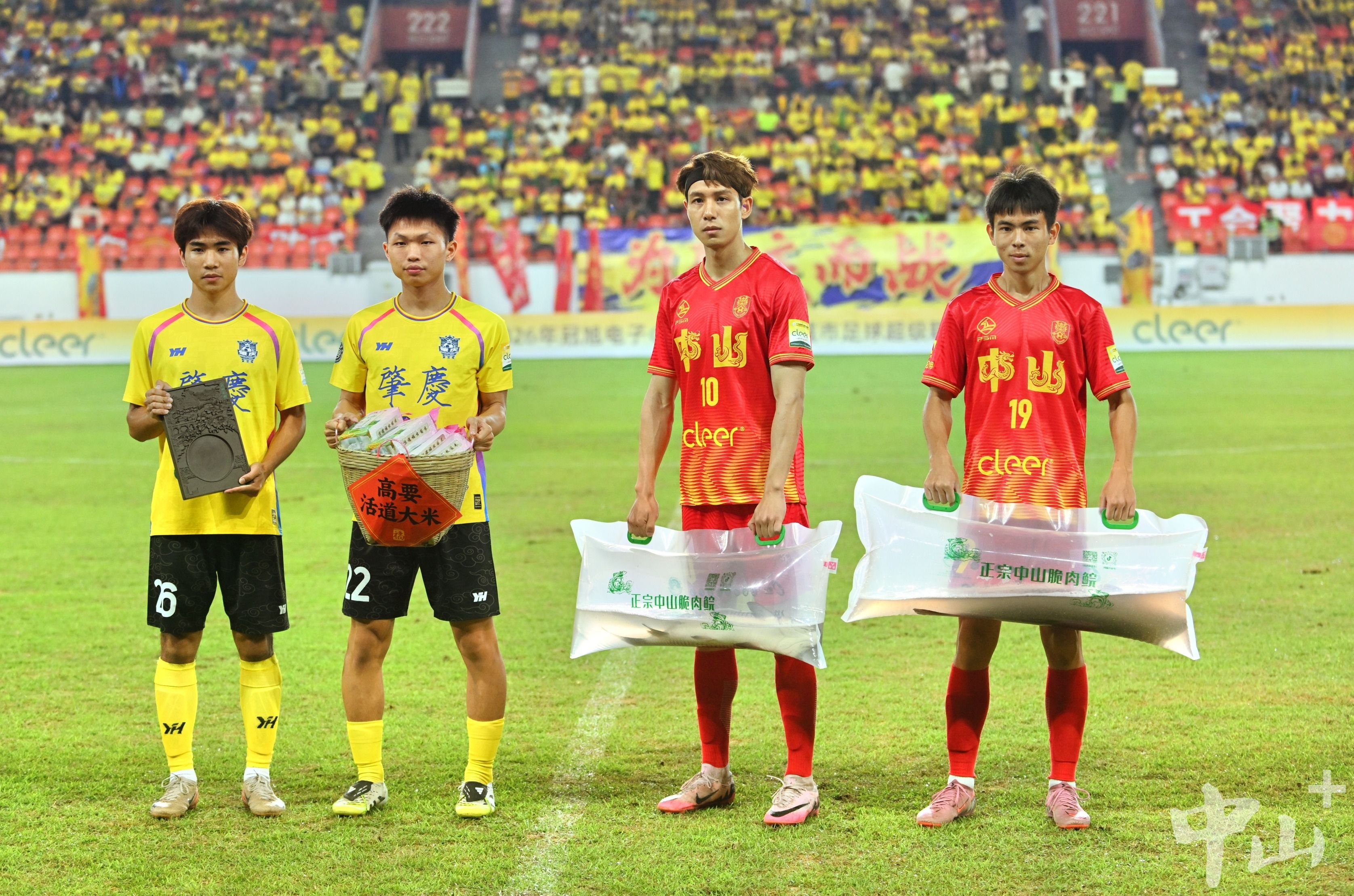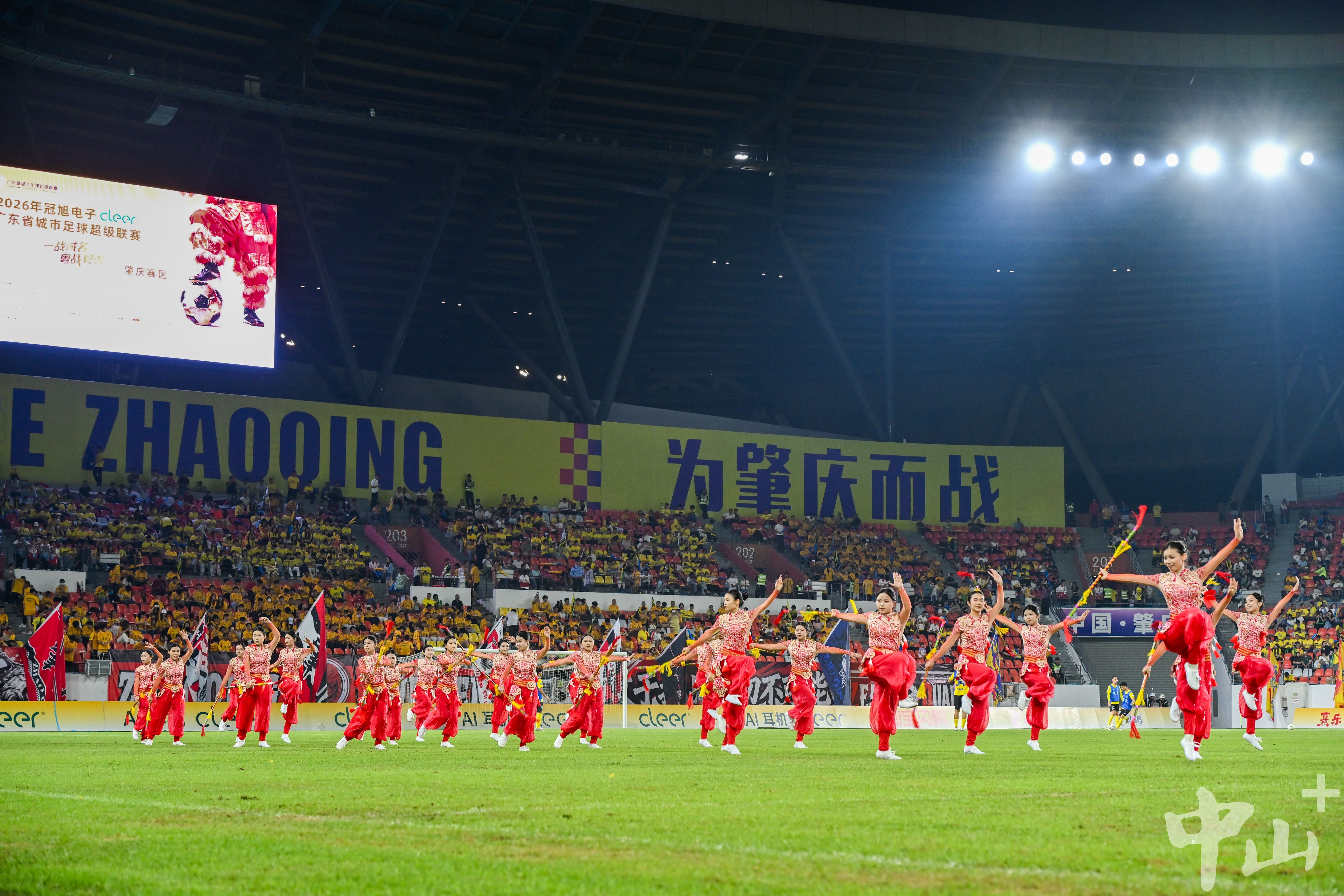 4月26日晚,2026年广东省城市足球超级联赛首轮,中山队客场迎战肇庆队的比赛上半场结束后,双方互换礼物,并上演了精彩的节目。