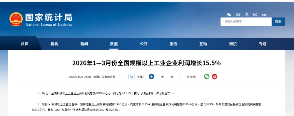 1—3月份,全国规模以上工业企业实现利润总额16960.4亿元,同比增长15.5%(按可比口径计算,详见附注二)。