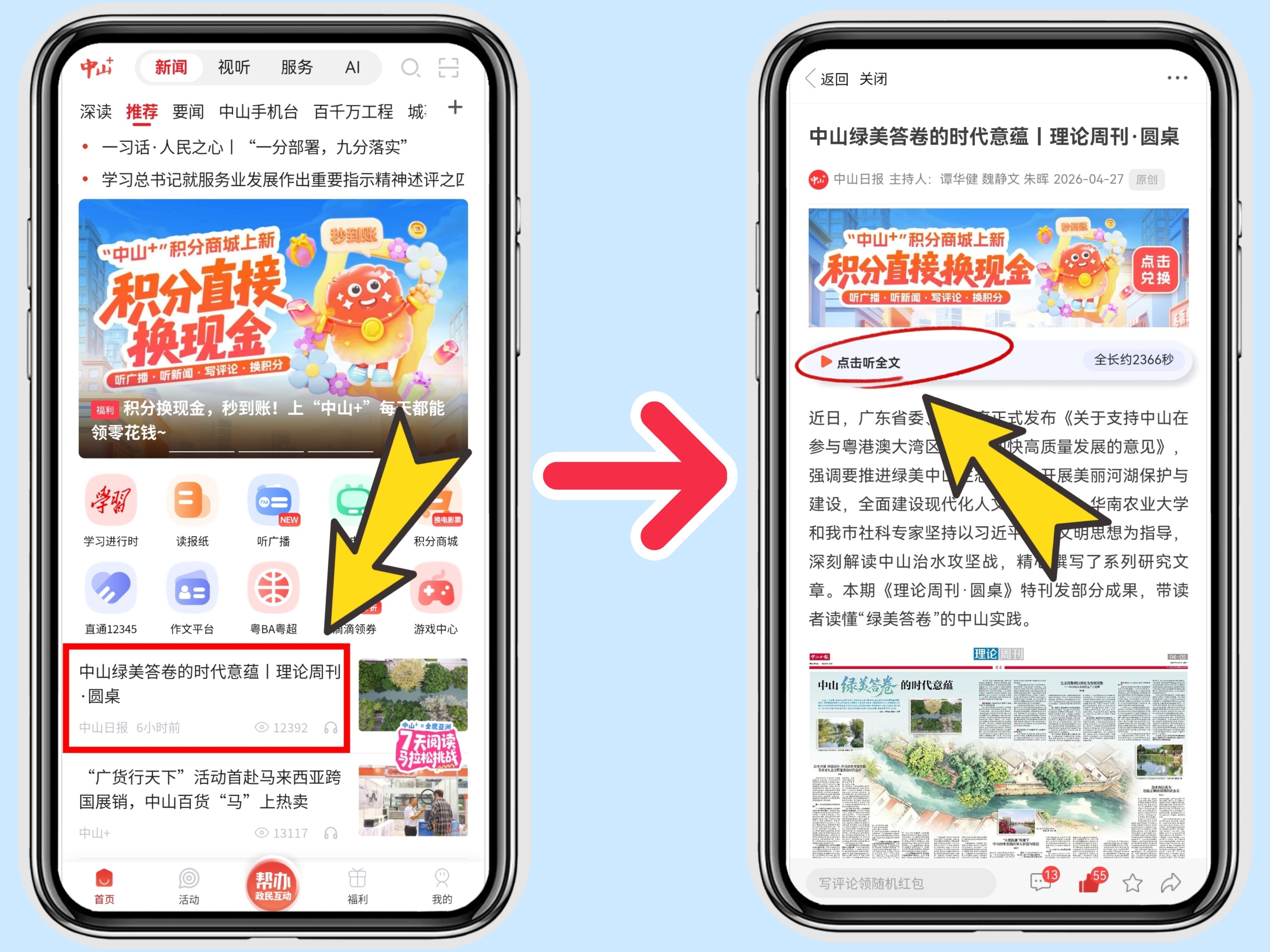 方式二:进入“中山+”,点开任意一条你感兴趣的新闻去“听全文”,就能边听新闻边自动累积积分。