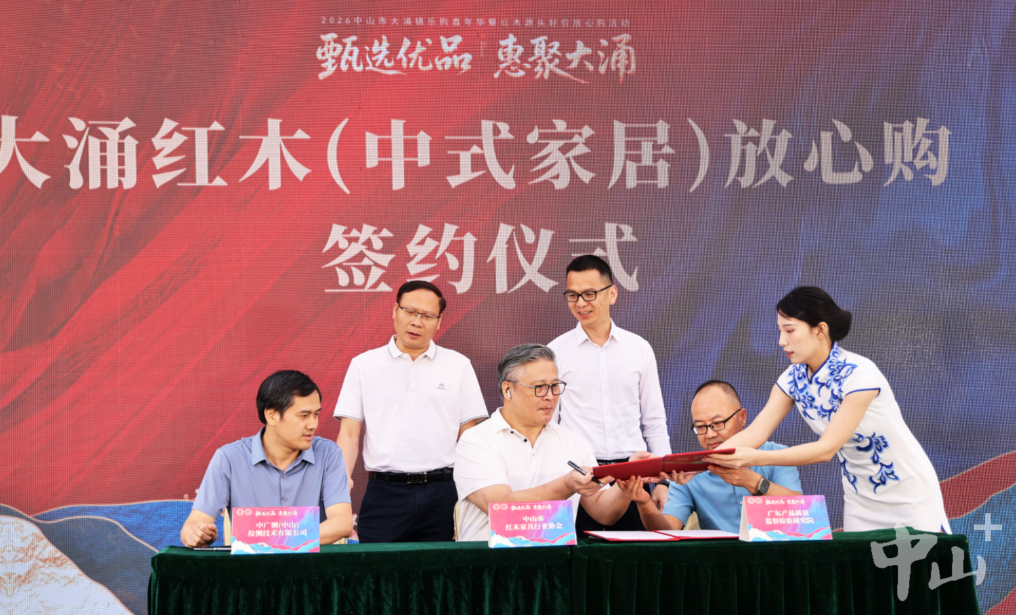 本次活动一大亮点是“大涌红木(中式家居)放心购”活动正式上线。为破解家具消费痛点,大涌镇全力打造红木(中式家居)“放心购”体系。现场,中山市红木家具行业协会与广东产品质量监督检验研究院、中广测(中山)检测技术有限公司签署合作协议,并为14家红木企业授予“放心购”示范牌匾,以权威检测、行业自律、示范引领,直击红木家具“材质真假难辨”“工艺标准模糊”等消费痛点,让消费者买得放心、用得安心。