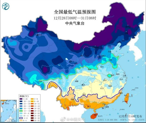 据了解,这次寒潮有两大特点,一是降温幅度剧烈,二是大风持续时间长。有气象预测平台将这次跨年寒潮与2016年1月份的“霸王级”寒潮相提并论。