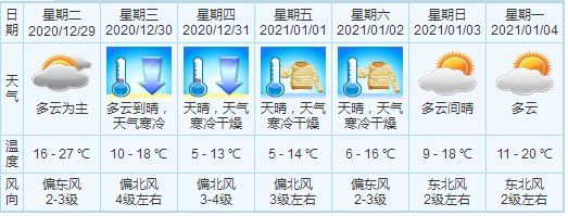 中山市气象台预计,30日凌晨起受寒潮天气影响,我市气温急剧下降,并伴有6-8级大风;31日至1月1日,天气持续寒冷,最低气温可达5度左右。本次寒潮过程降温明显,请注意准备御寒衣物,适时添衣保暖。森林火险等级高,注意用火用电安全。受冷空气影响,风力明显加大,户外活动需注意安全。