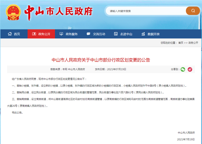 经广东省人民政府同意,现将中山市部分行政区划变更情况公告如下: