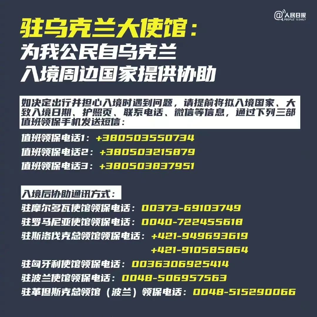 沿途以安全为第一。大使馆已和驻摩尔多瓦、罗马尼亚、斯洛伐克、匈牙利、波兰使馆协调,为从乌克兰前往上述国家的中国公民提供通关便利协助。如决定出行并担心入境时遇到问题,请提前将拟入境国家、大致入境日期、护照页、联系电话、微信等信息,通过下列三部值班领保手机发送短信。
