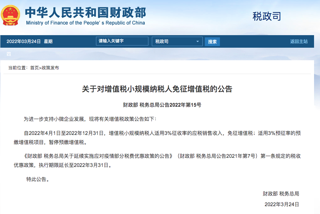 3月24日,财政部、国税总局发布公告称,自2022年4月1日至2022年12月31日,增值税小规模纳税人适用3%征收率的应税销售收入,免征增值税;适用3%预征率的预缴增值税项目,暂停预缴增值税。
