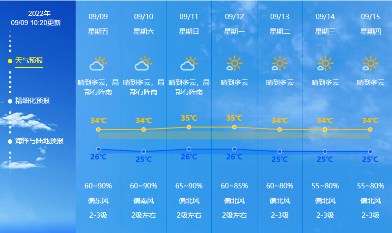 11-12日,粤西市县多云,有分散(雷)阵雨,局部大雨,其余市县多云,局部有阵雨。最高气温:广东大部市县31℃~35℃,其中粤北和粤东的部分市县36℃左右。