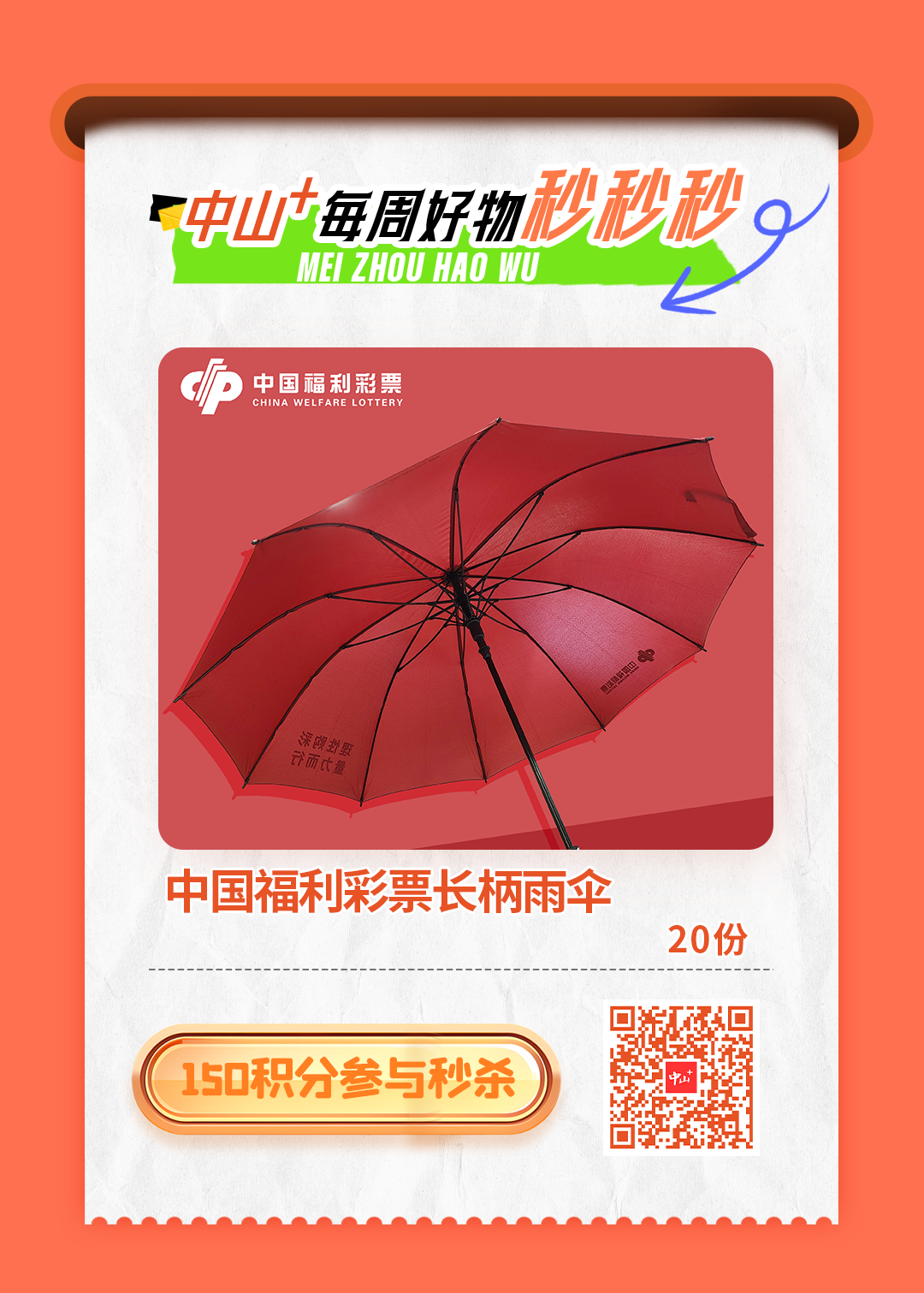 2024年2月7日上午10时,中山+用户前往中山+积分商城,即可用150积分限时秒杀,本周共送出20把中国福利彩票长柄自动雨伞,兑完即止。每个中山+ID每周可参与秒杀一次。(注:春节期间每周三秒好物将暂停一期,2月21日恢复活动)