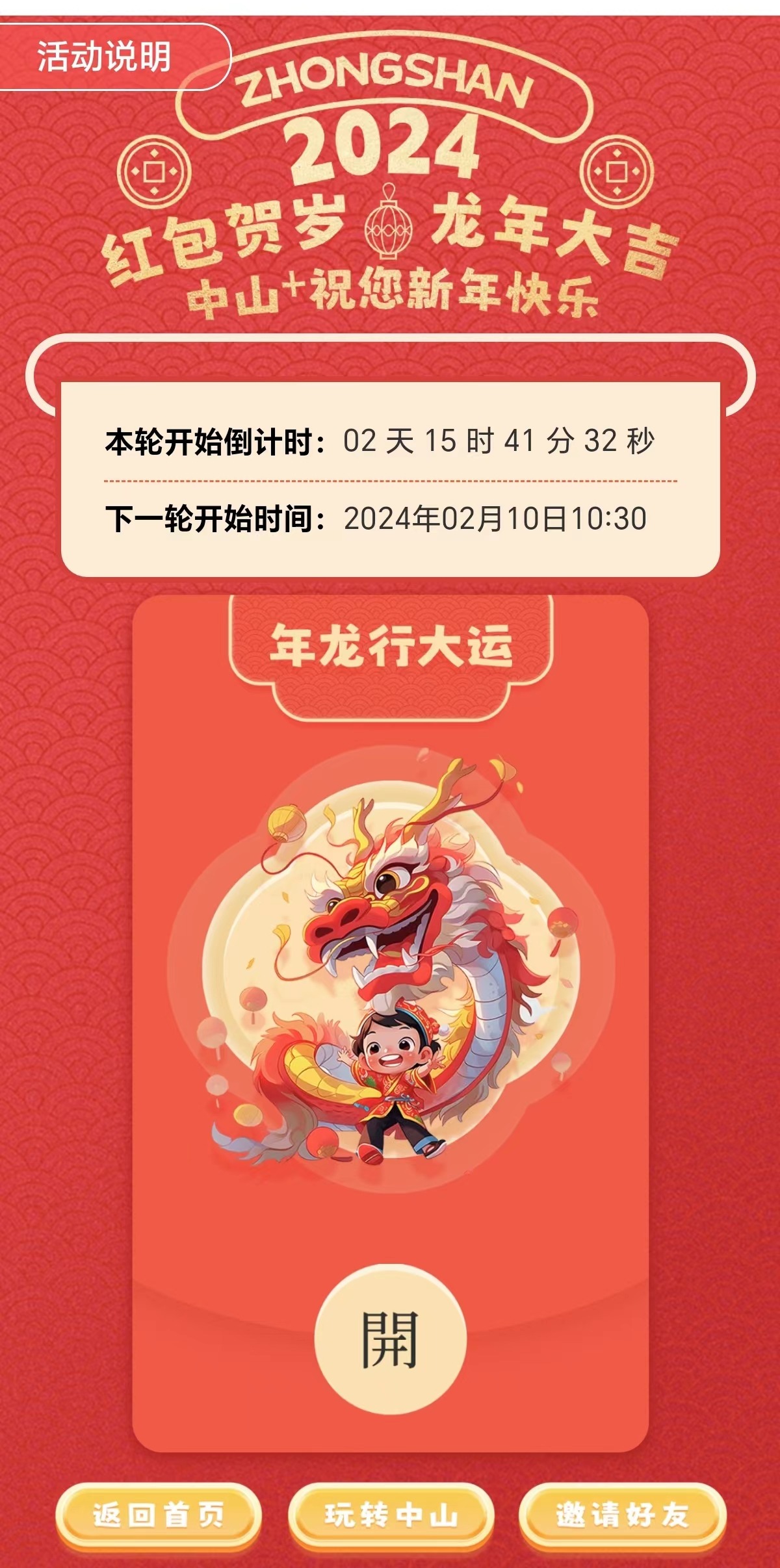 龙年春节将至,中山日报中山+客户端给您提前拜年啦!祝亲爱的网友们新春快乐,吉祥如意!!从2月9日除夕起,中山日报中山+客户端将送出三轮共2万元现金红包,陪您一起过大年。