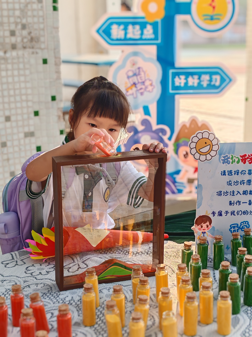 瞧!五彩斑斓的流沙如魔法般在孩子们手中流淌,他们小心翼翼地将其倾倒入画框,共同绘制出一幅幅关于阳光、自信、拼搏、勇气和幸福的新学期蓝图。流沙缓缓,梦想渐明。