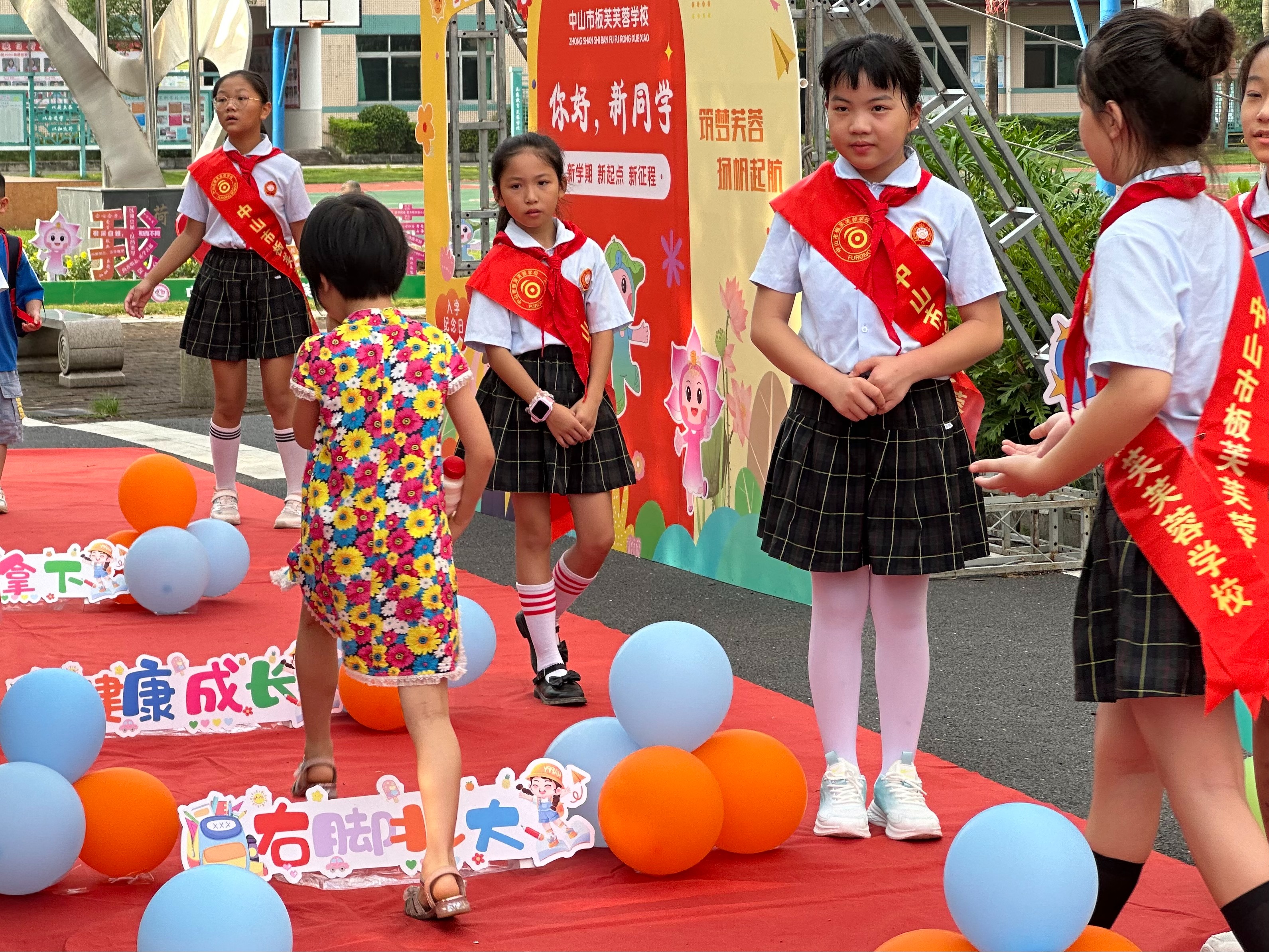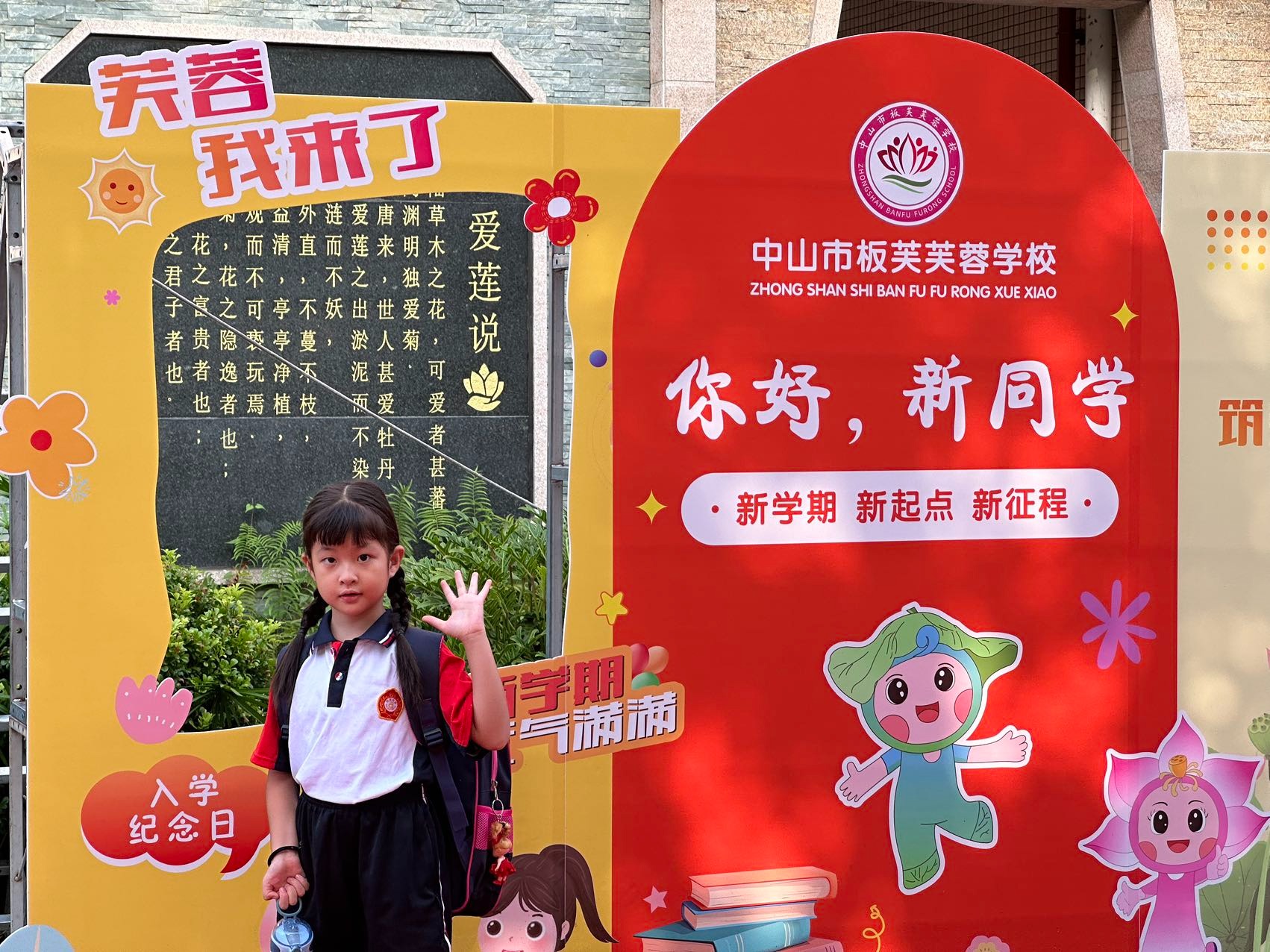打卡拍照启梦想: 学校精心准备了别开生面的拍照签到墙,孩子们快乐合影,记下入学的难忘时刻。