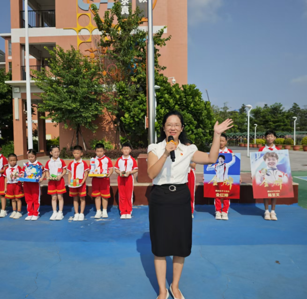 随后,黄艳冰校长以热点话题“巴黎奥运”为切入点,为获得3米板跳水的双金得主中山运动健儿陈艺文、蝉联奥运会10米板跳水的广东金牌名将全红婵点赞,带领同学们在互动交流中,感悟坚持、拼搏、不断超越自我的奥运精神。黄校长还风趣地做出全红婵“小小巴黎,拿捏”的手势,鼓励同学们把“拼搏”精神融入学习,做自己的冠军!