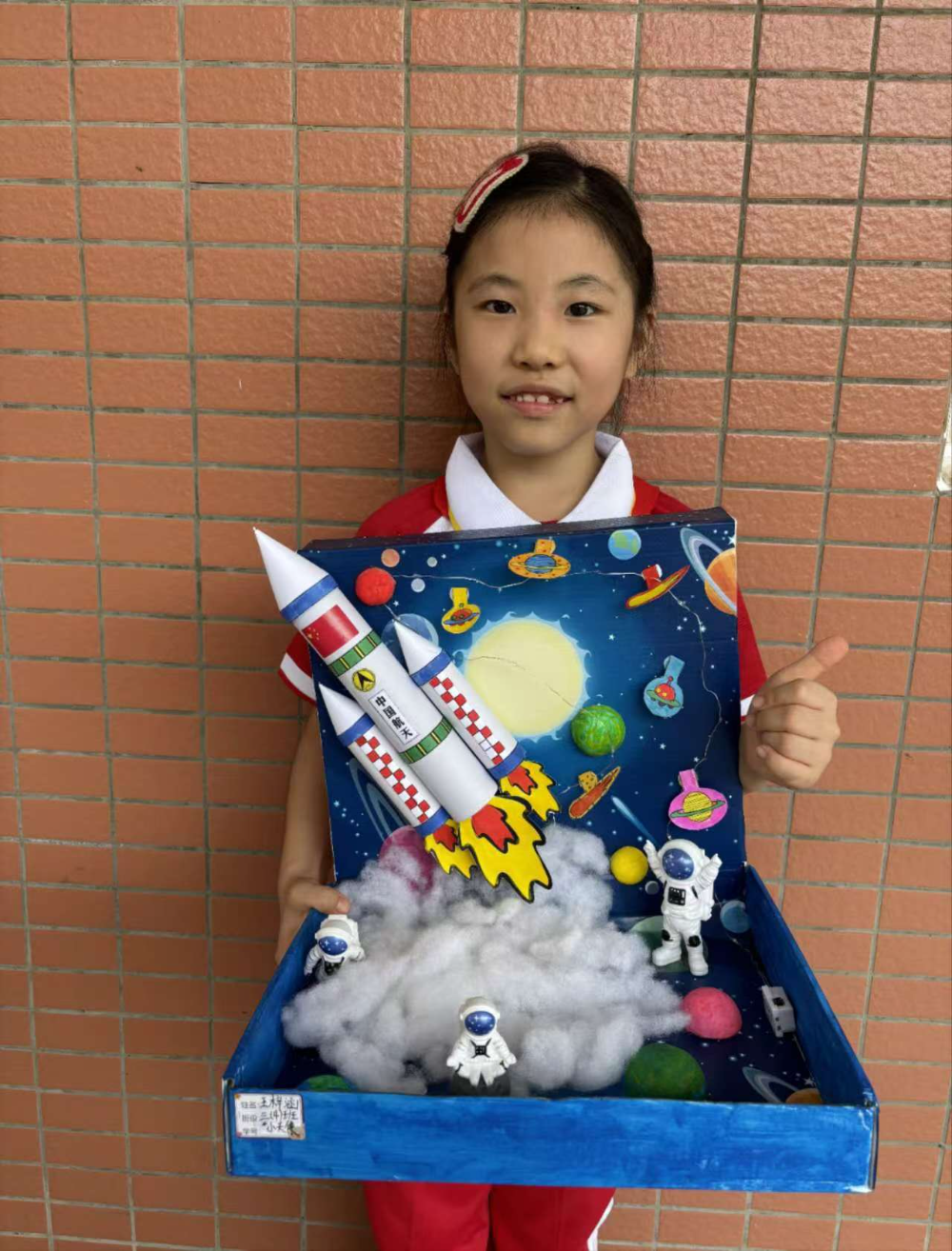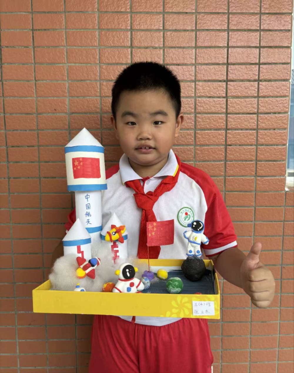 黄校长积极响应党的二十大报告中绿色发展的号召,引导同学们在假期制作“纸巾筒大变身”创意手工作品,现场展示同学们奇思妙想的创作,如三4班王子涵同学精心制作的“中国神奇火箭”、二1班吴凯迪的“中国航空”、二4班“中国超级坦克”等。