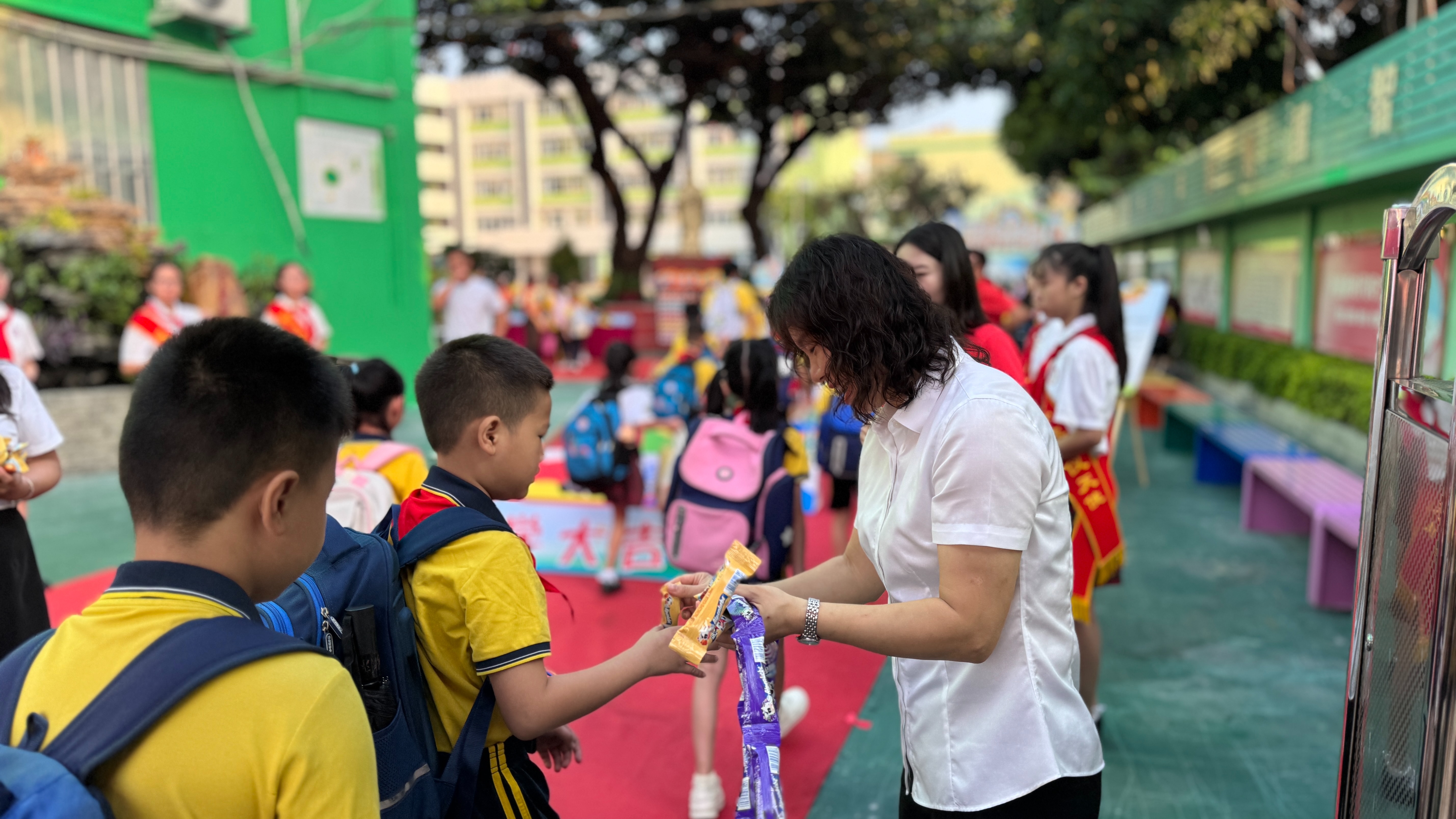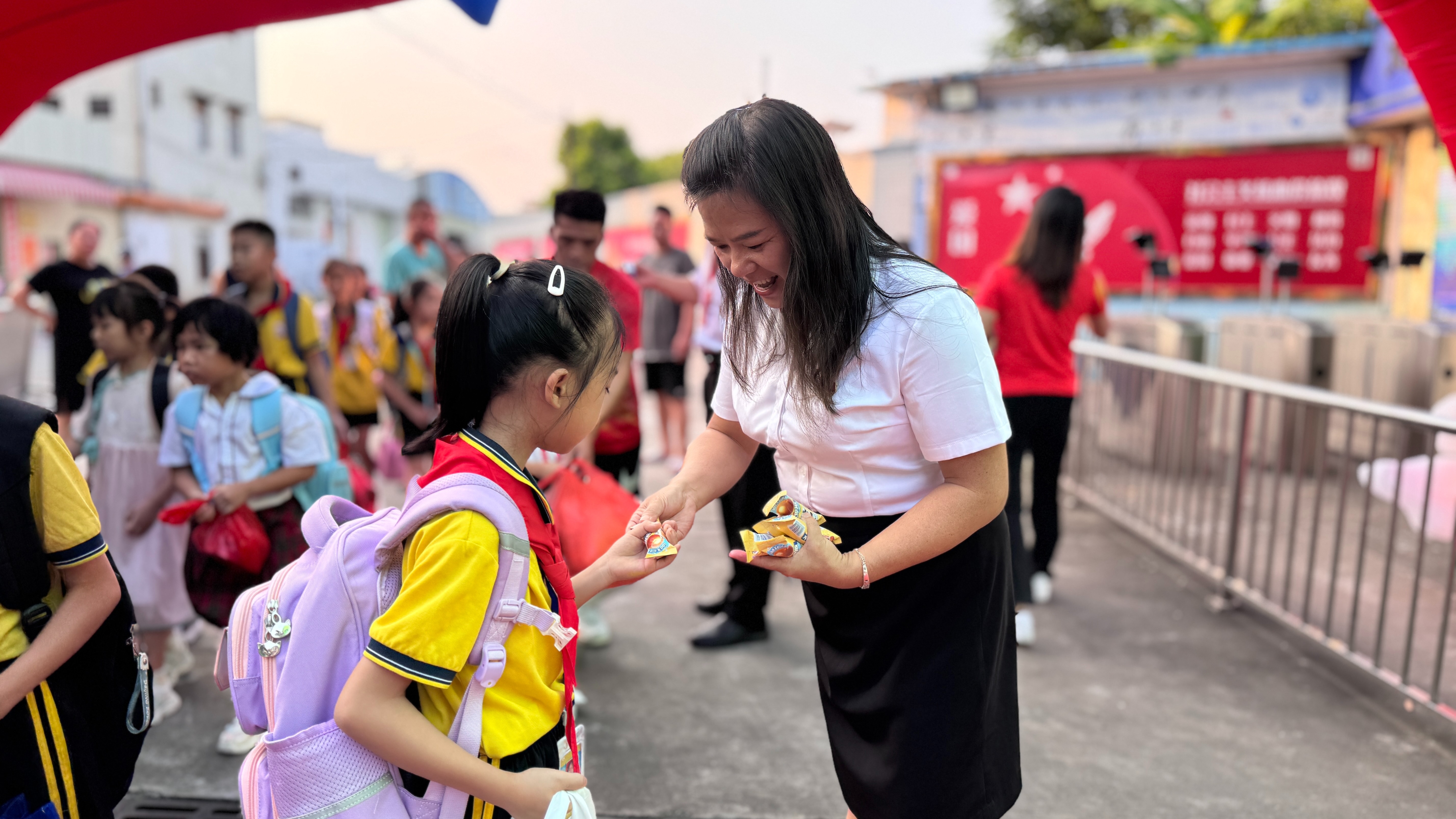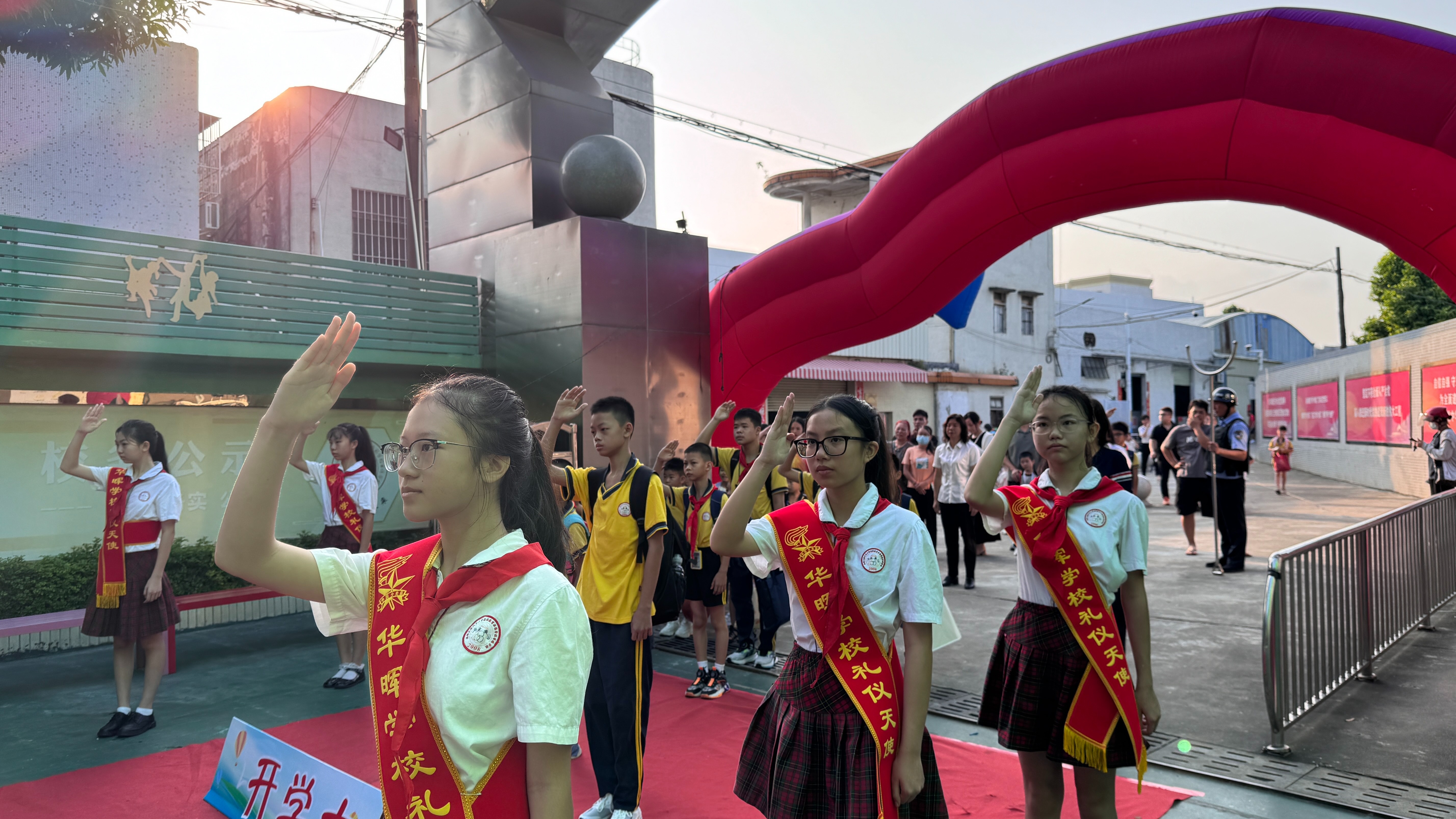 你看,学校行政们在校门口亲切地迎接每一位学生,为同学们送上一份棒棒糖,祝愿孩子们在新的学年里,身体棒!学习棒!心情棒!华晖学子漫步走过红毯,跨过开学愿景,沿着学生摆台依次摸苹果、橘子、大葱、芹菜和胡萝卜等,寓意新学期平安大吉,聪明伶俐。全体华晖学子脸上洋溢着幸福的笑容,以饱满的精气神迎接新学年的到来,开启新学年的开学第一天。