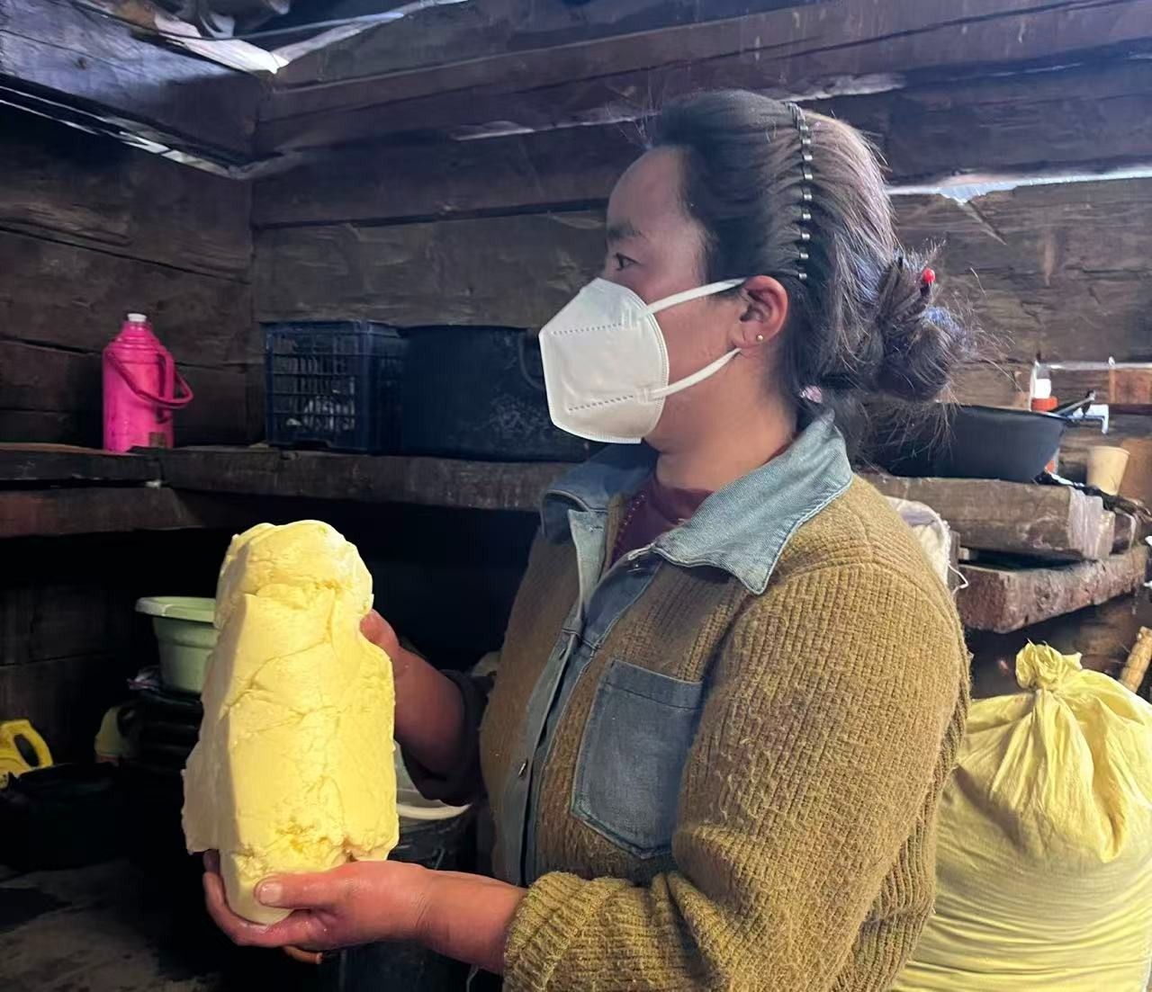 次旦欧珠介绍,新措村的牧民通过制作酥油茶,加上松茸季采摘、白草(虫草的一种)采摘和卖牦牛肉,人均年收入约两三万元。