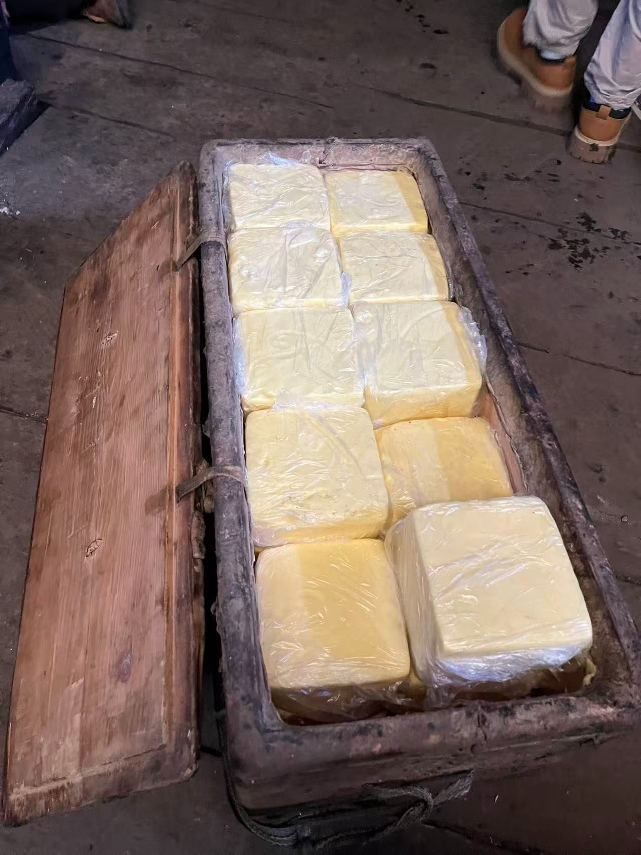 不过还没完,边巴顿珠将一大块酥油放在案板上,继续用手将酥油塑成方方正正的一大块。一般来说,一块就是一斤重。做好的酥油放入冷水冷却后,再密封起来。