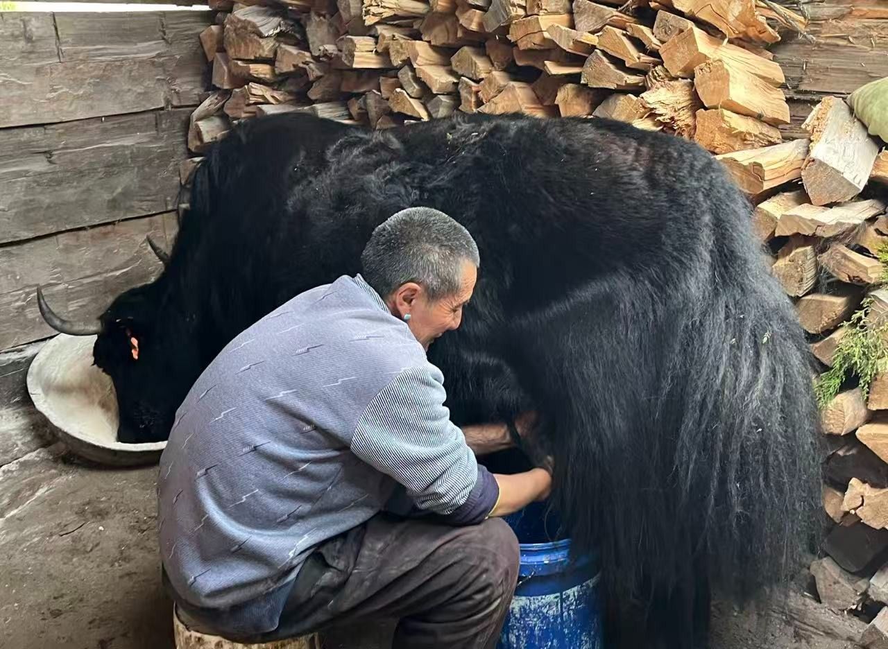 一口黑色大锅架在火塘上,里面是泛着白沫的新鲜牛奶,这是工布江达县罗池村牧民边巴顿珠和妻子、父亲一大早挤的牦牛奶。