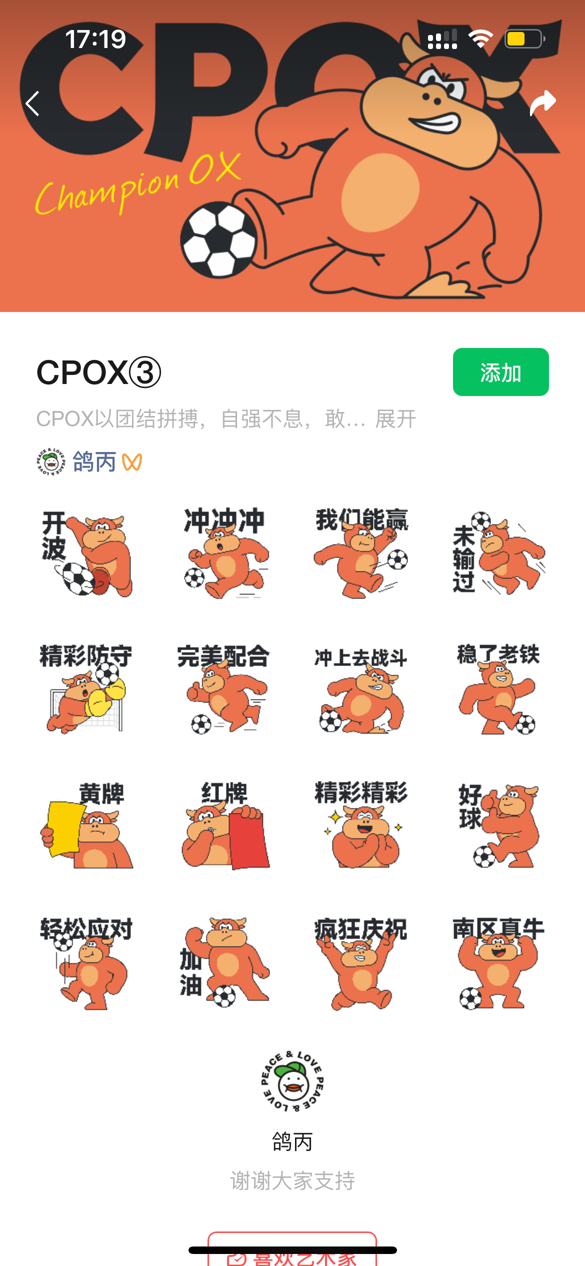 如今,随着中山“镇超”赛事热度攀升,“冠军牛”再次实现跨界。刘君杰将其精神内核与足球运动的热血特质相融合,打造出镇超专属表情包。目前上线的第一套表情包聚焦赛场实况,包含“开波”“冲冲冲”“我们能赢”“精彩防守”“完美配合”“黄牌”“红牌”“稳了老铁”“疯狂庆祝”“南区直牛”等16个常用表达,画面生动、语言亲切,迅速在球迷群中流传。