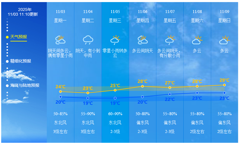 中山气象台预计,受弱冷空气补充影响,11月3日我市阴天间多云,偶有零星小雨,气温有所下降;4日阴天,有小到中雨,体感阴凉,最低温度可能低于20℃;5日起转多云,气温逐步回升;展望6-7日,我市云量增多,有分散小雨。