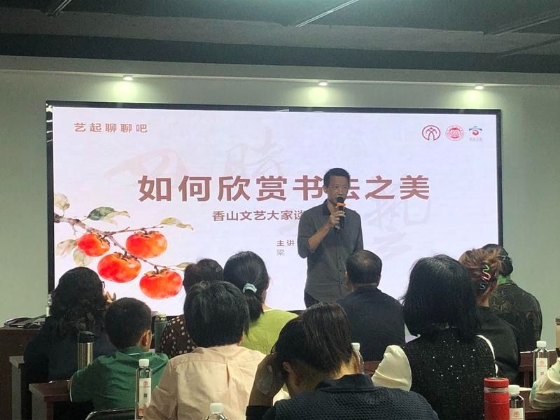 “我们平时逛展看过不少书法作品,却不懂欣赏。老师有什么好办法?”11月8日下午,由中山市文学艺术界联合会、中山开放大学联合主办的“艺起聊聊吧——香山文艺大家谈”系列活动首场讲座在中山文联文艺家活动中心开讲。中山市书法家协会副主席兼秘书长梁斌带来一场题为“如何欣赏书法之美”的讲座,为群众架起一条通往鉴赏书法艺术的桥梁。