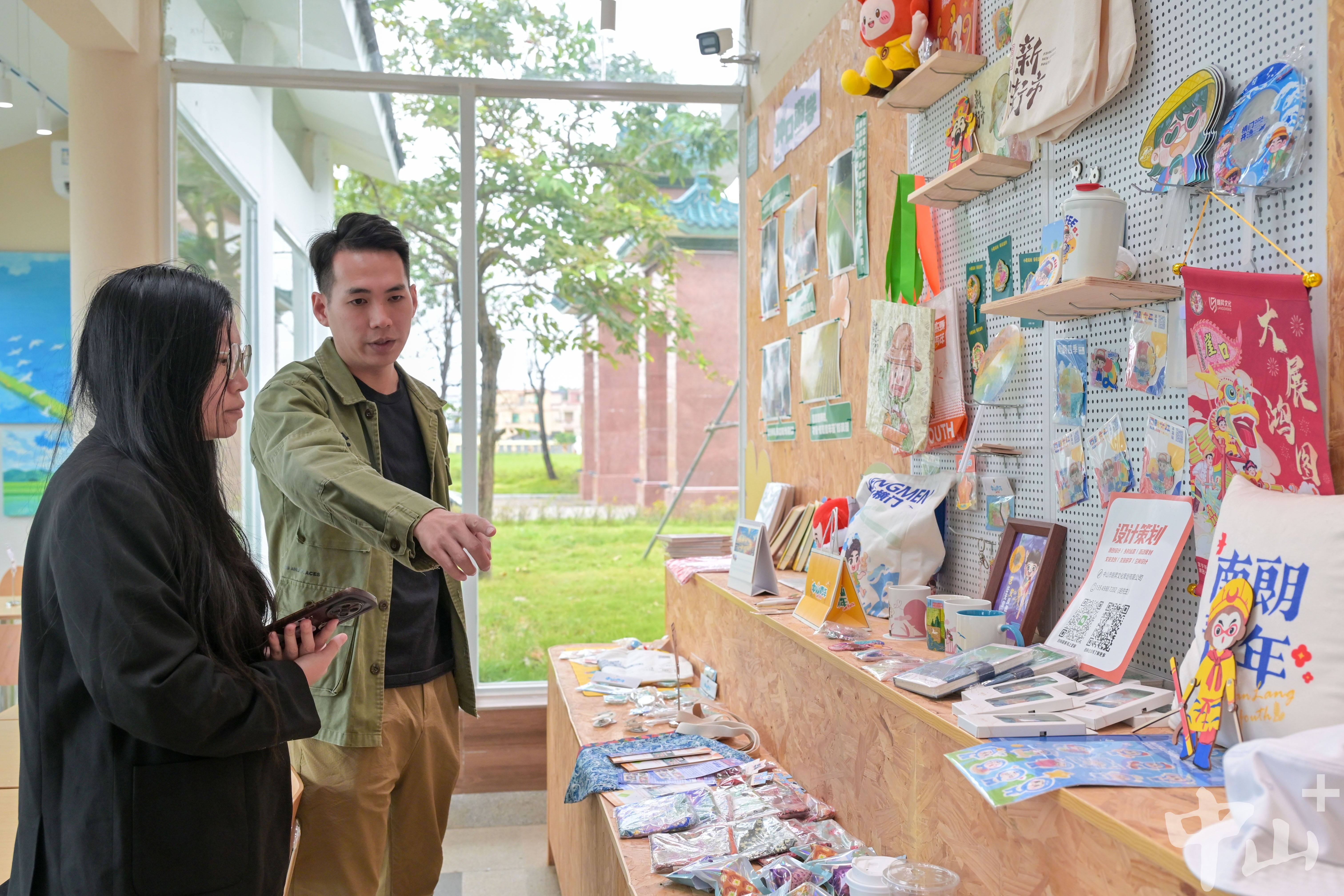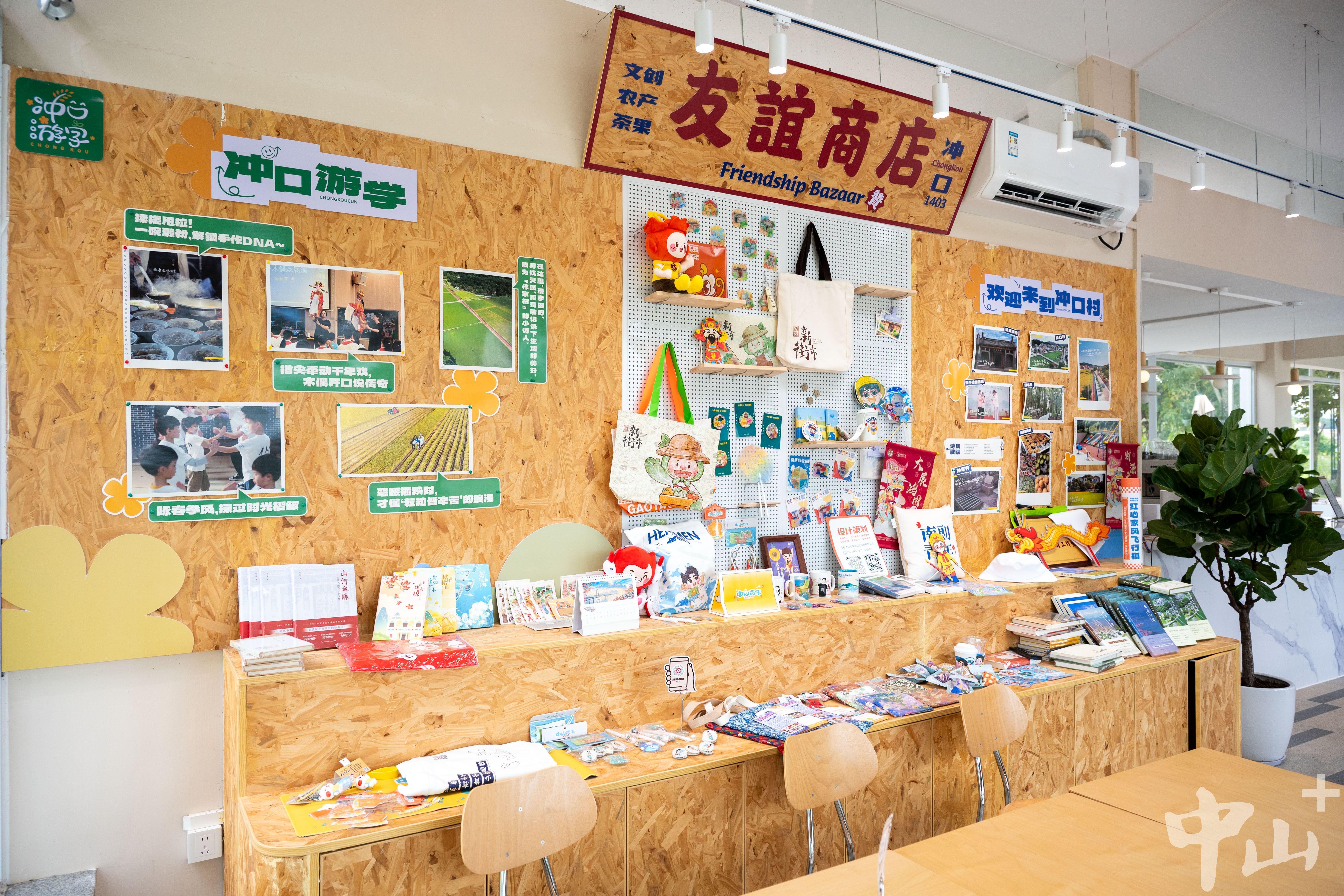 走进这家藏在稻田边的咖啡店,处处都能感受到“乡村专属”的巧思:主打产品“米乳咖啡”,将本地大米磨浆融入咖啡,让传统农产品焕发新滋味;墙面装饰画是艺术家或者学生写生原创的冲口村风光画;广东人民出版社中山出版有限公司出版的南朗街道各村落系列文化丛书,也大大方方展示着,引导访客阅读;陈列架上,刺绣荷包、非遗冰箱贴等文创产品错落摆放。