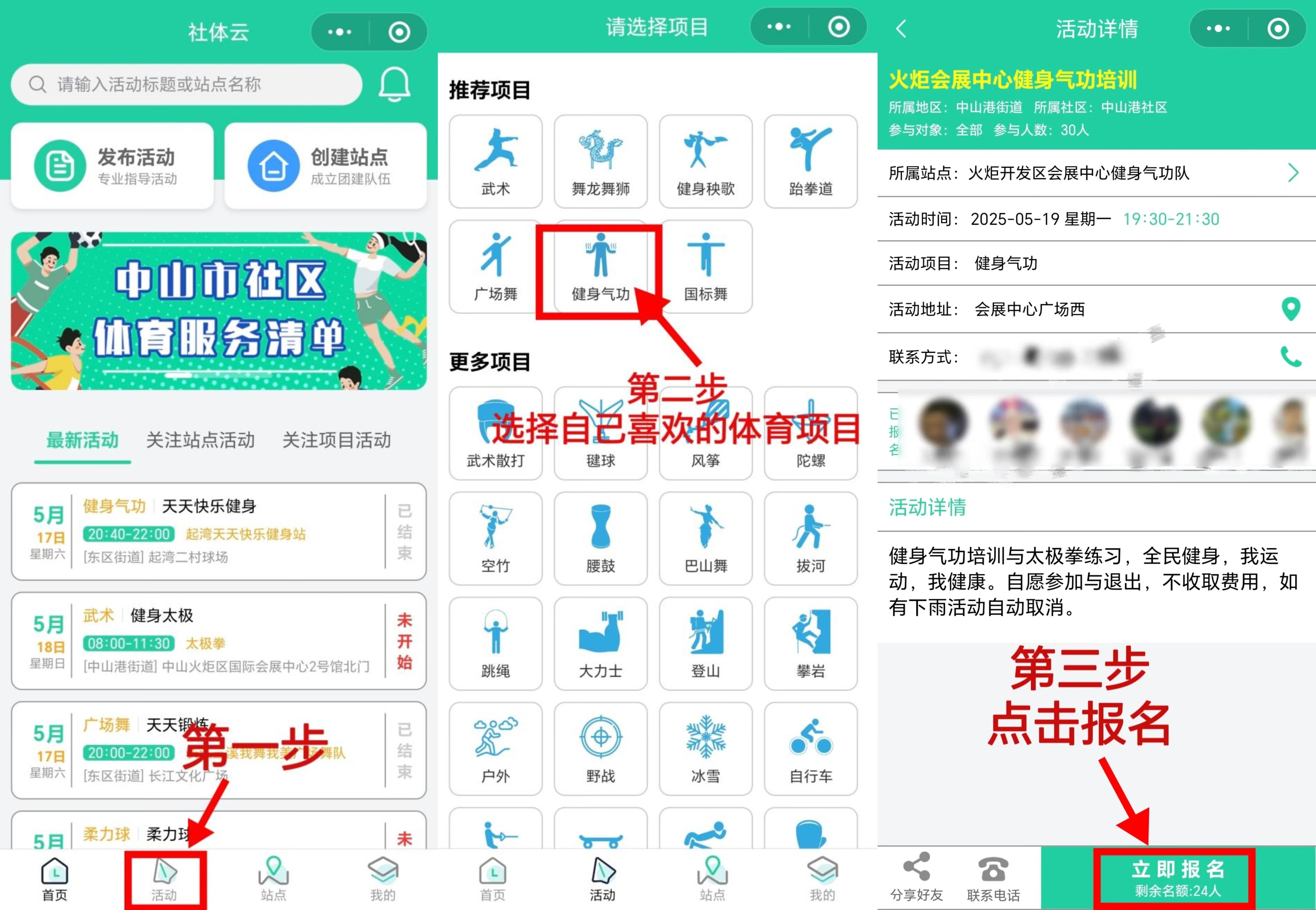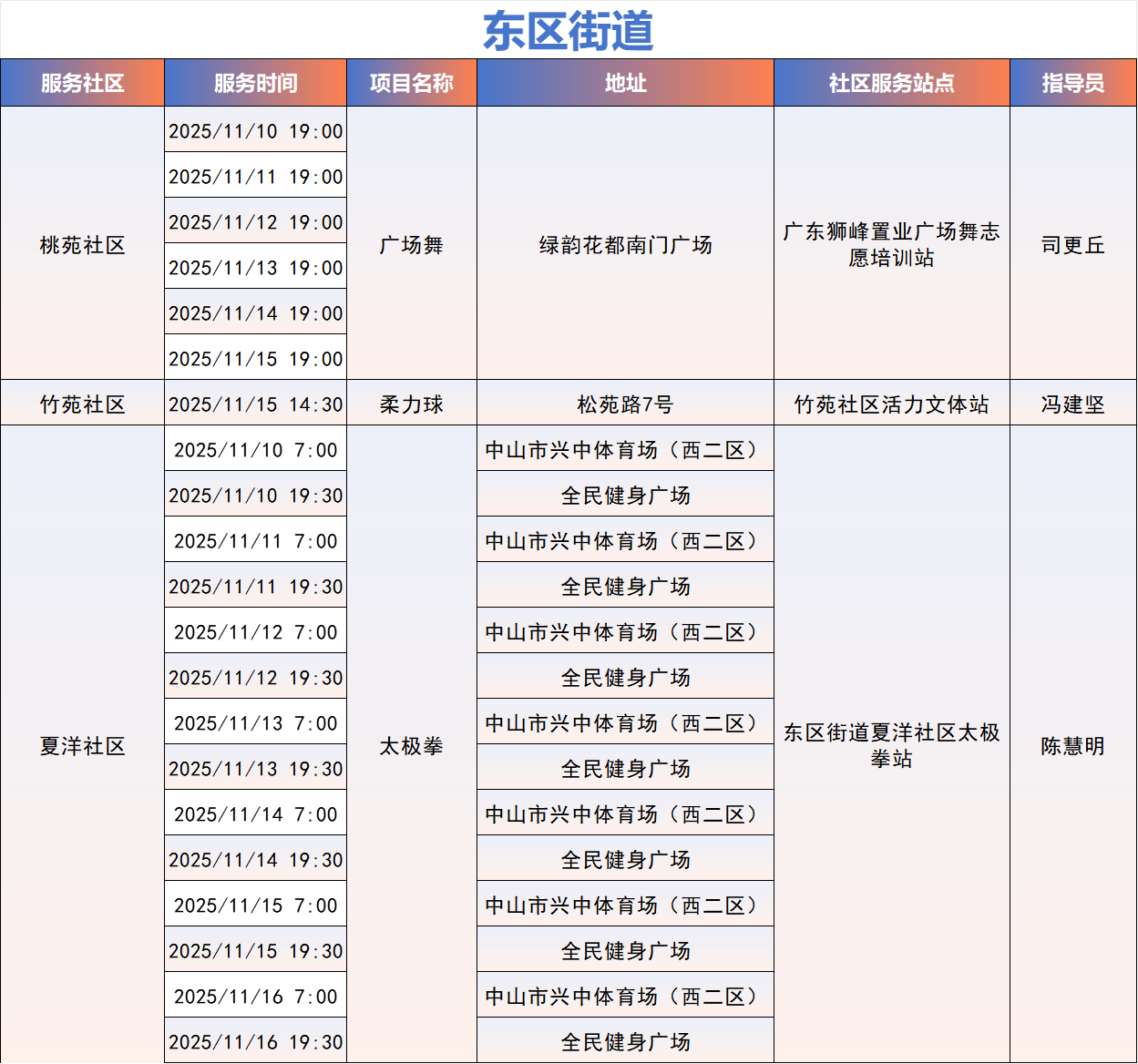 为加强科学健身指导服务,中山市体育发展中心积极发动各运动项目的社会体育指导员,携手各镇街社会体育指导站点,广泛开展社区体育服务。社区体育服务涵盖健身指导、群众体育项目展示及培训等公益服务,现在各镇街的体育服务已就位:太极拳、广场舞、篮球、国标舞、健身气功等,总有一款击中你的运动DNA。