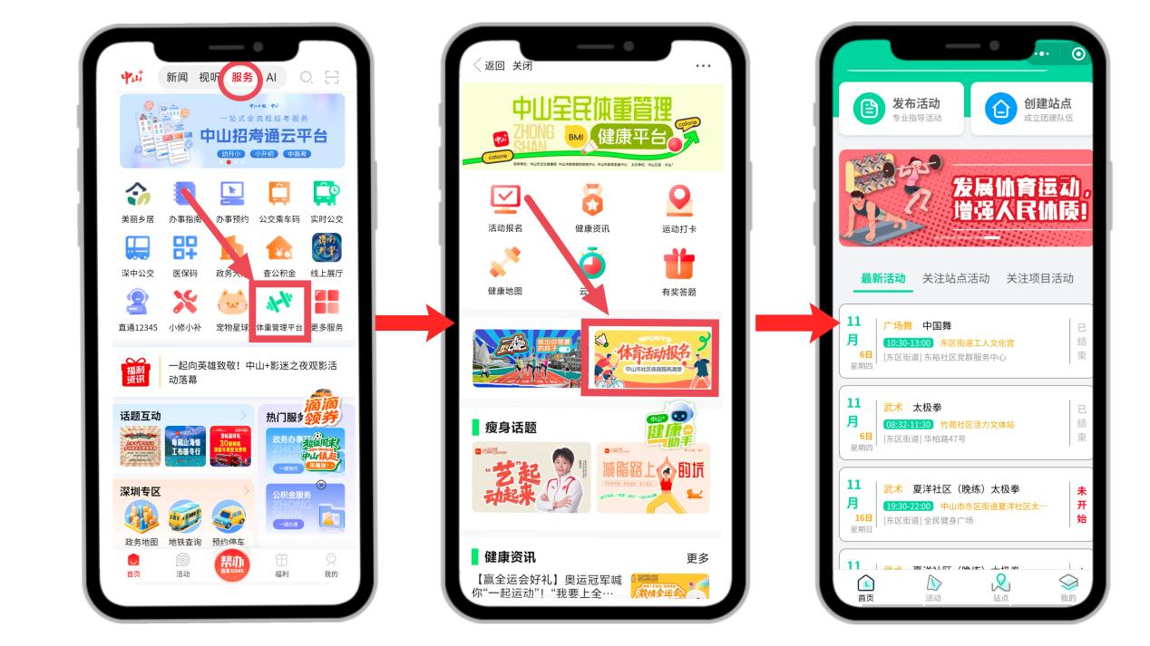 1.打开中山+,点击“服务”首页→“健康管理平台”图标,进入“体育活动报名”页面