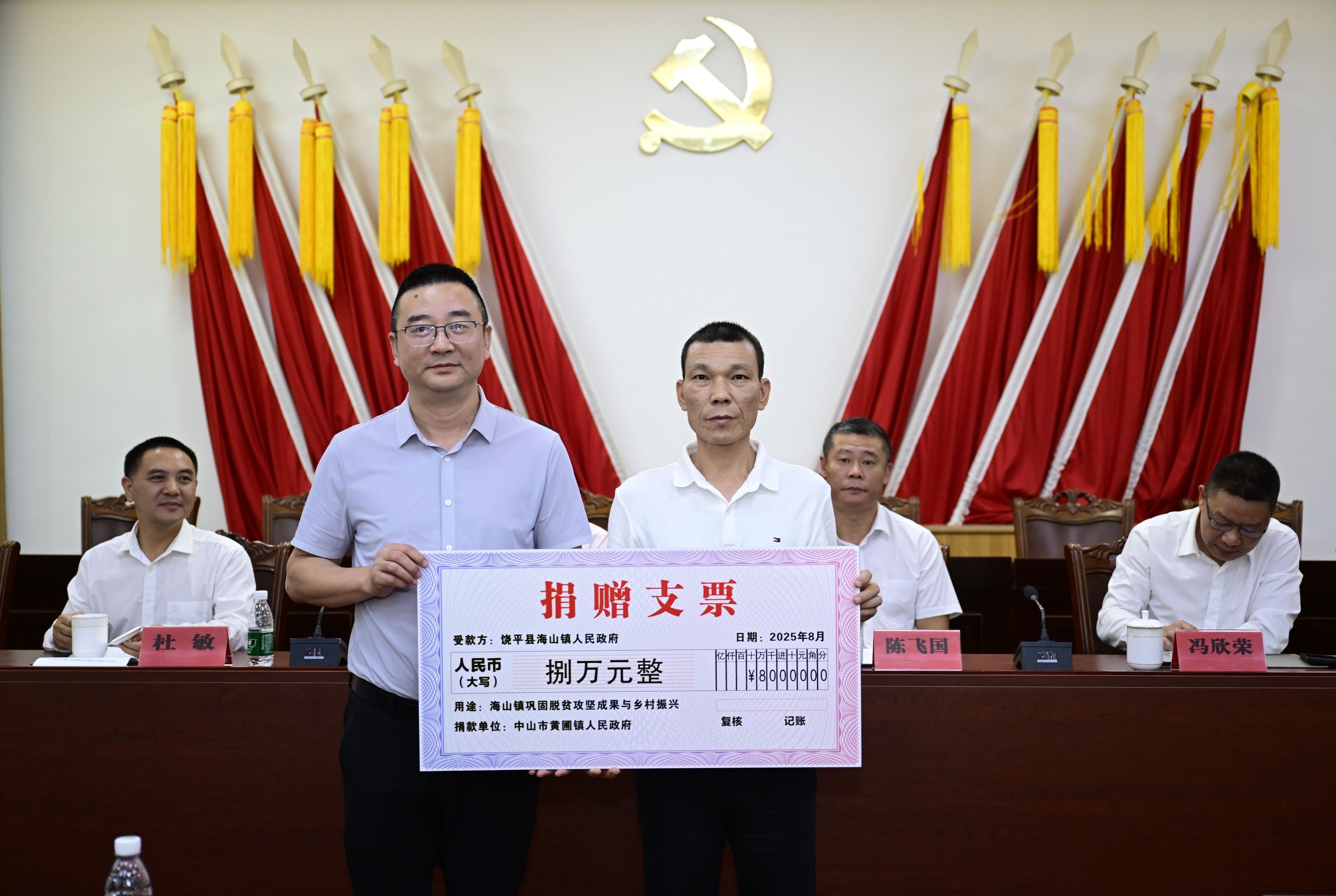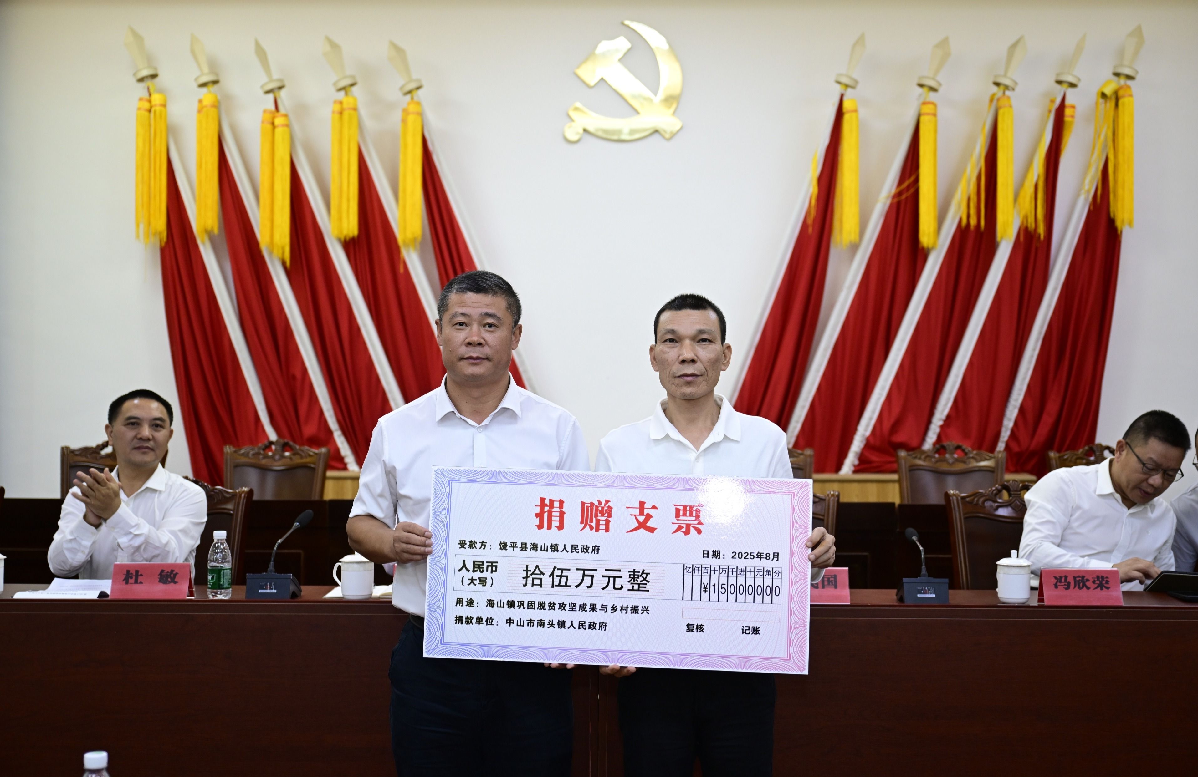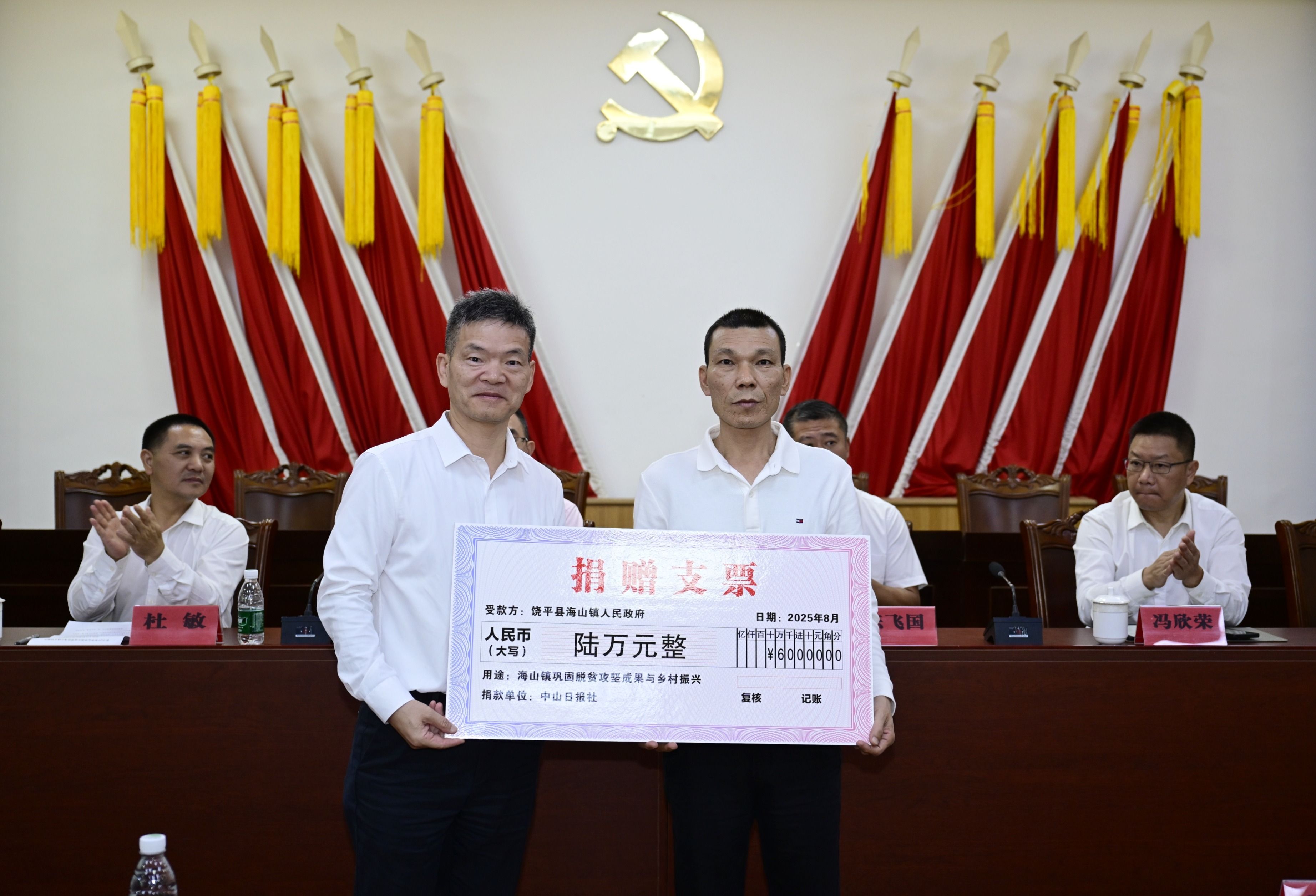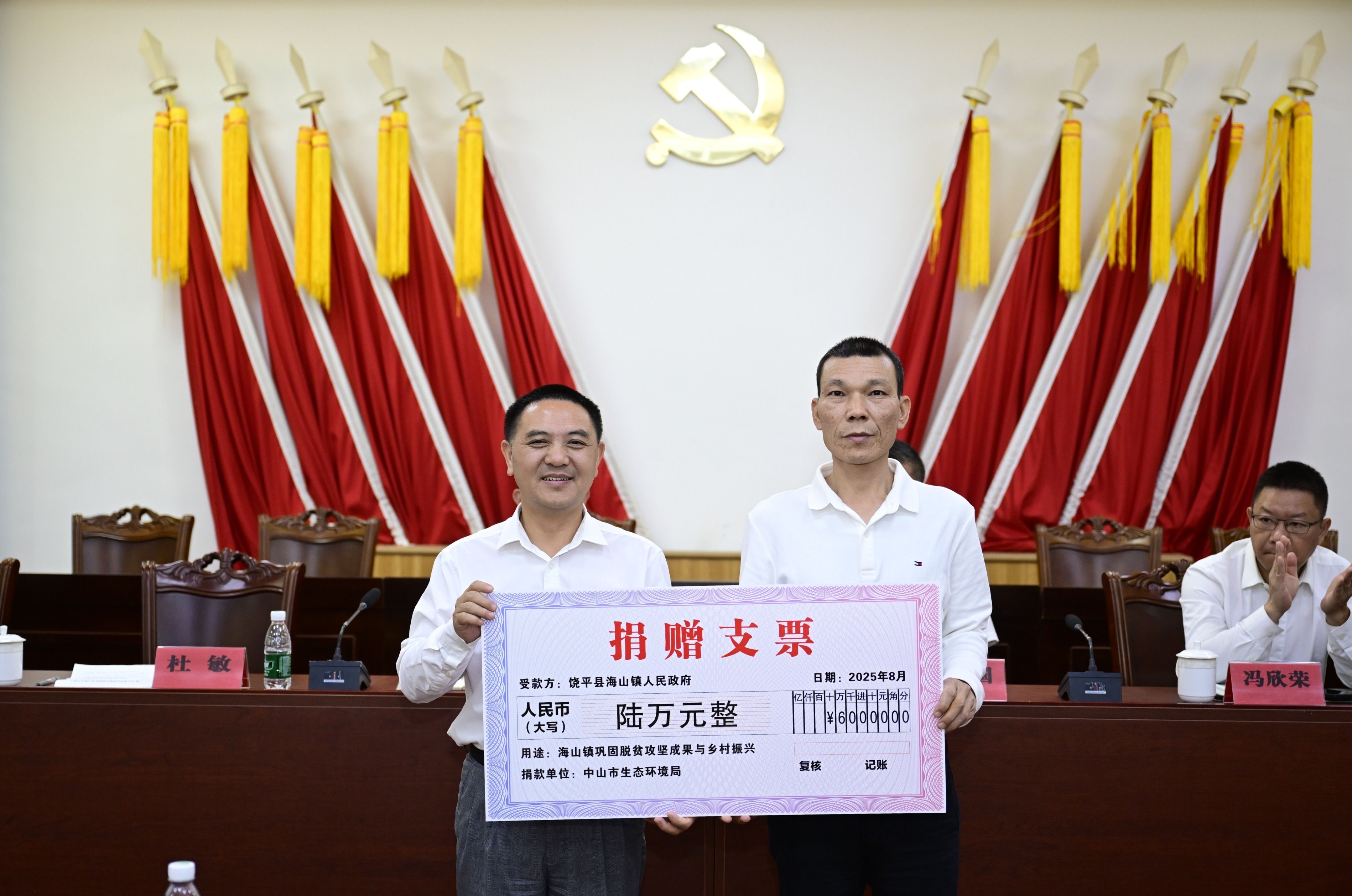 会上,中山日报社捐赠帮扶资金6万元,中山市生态环境局捐赠帮扶资金6万元,黄圃镇捐赠帮扶资金8万元,南头镇捐赠帮扶资金15万元,慈善资金10万元。各组团单位和爱心企业还为海山镇村居捐赠物资一批。