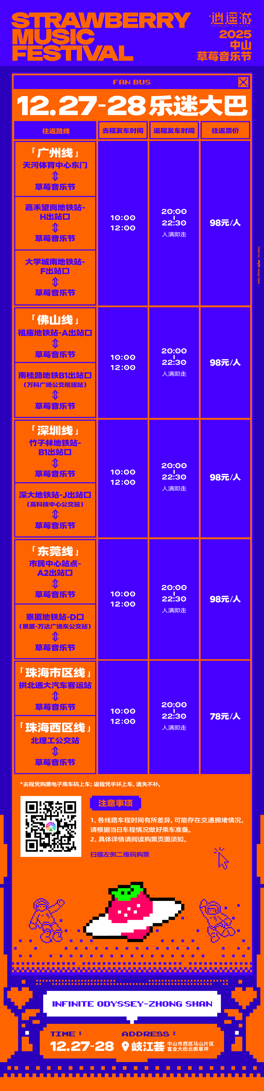 乐迷巴士起点分布在广州、深圳、佛山、东莞、珠海等地,终点位于草莓音乐节停车场(具体位置后续公布),预计步行10-20分钟到达音乐节检票口。