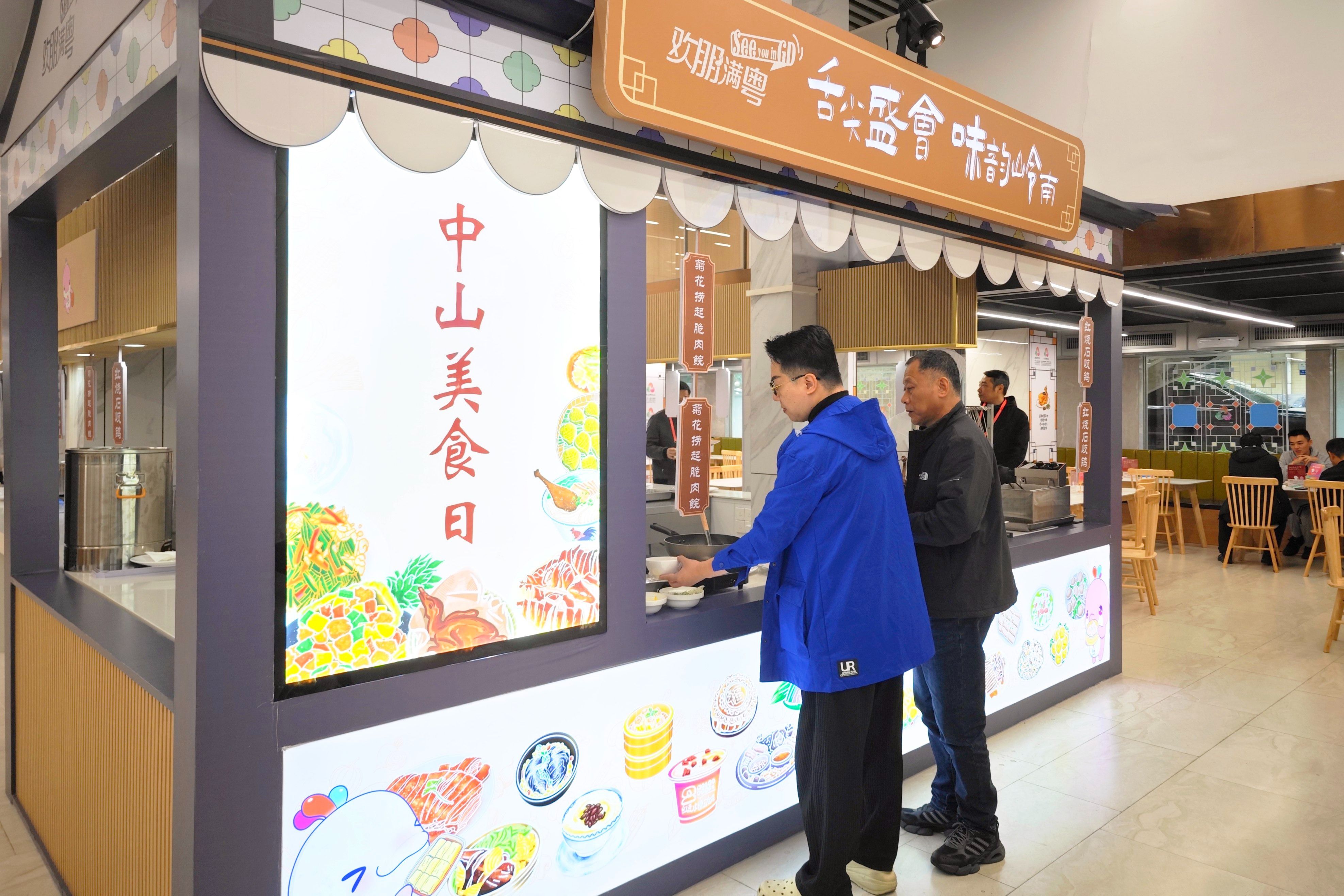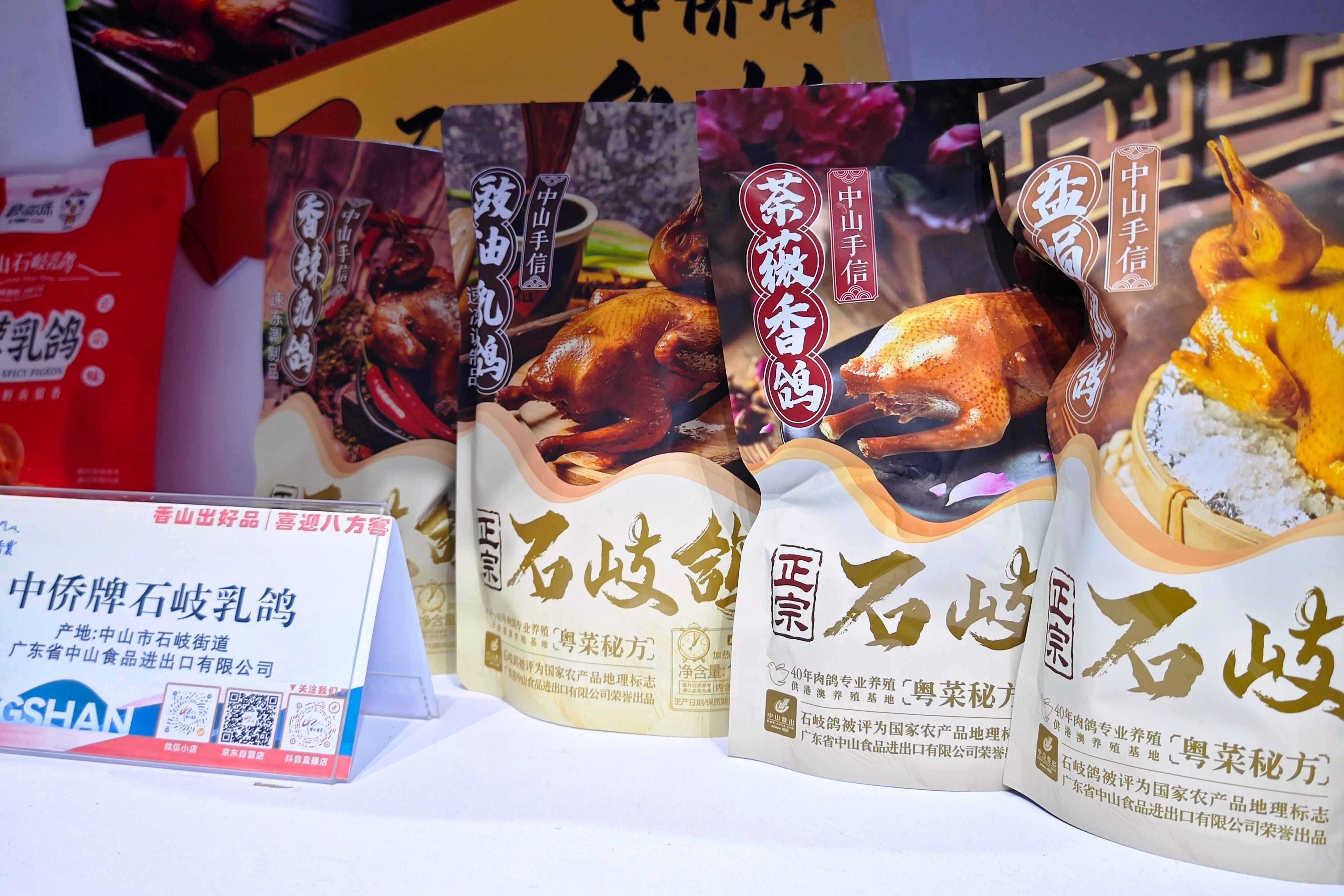 当天的十五运会主媒体中心餐厅内,近100款特色农产品与经典中山美食汇聚一堂。右侧入口处的“农立方”展馆内,“香山出好品,喜迎八方客”的标语格外醒目。石岐乳鸽、黄圃腊味礼盒、神湾菠萝酥、小榄菊花肉等拳头产品整齐陈列,以精致包装和深厚文化底蕴吸引着众多目光。