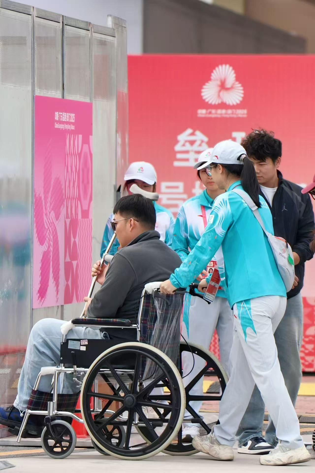 除了指引路线、维持秩序、帮拍合照、解答问询等常规服务,还要应对各种突发事件。赛事第一天,志愿者就遇到了一位拄双拐的观众,他从四川远道而来,虽然腿受伤了,也要见证支持的球队赢球。志愿者们立刻启动了“无障碍运送”机制,从东门借来公共轮椅让这位球迷就座,一边查验门票,确认观赛场次,并立刻报告相应场馆的负责人;随后推着轮椅将送他平稳到赛事场馆楼下,再和馆内观众区志愿者通力合作,接送至无障碍观赛区。这样流程,每天都在发生,“小海豚”们默契配合、服务周到,让每一位观众都能带着暖意、安全舒适地观赛。