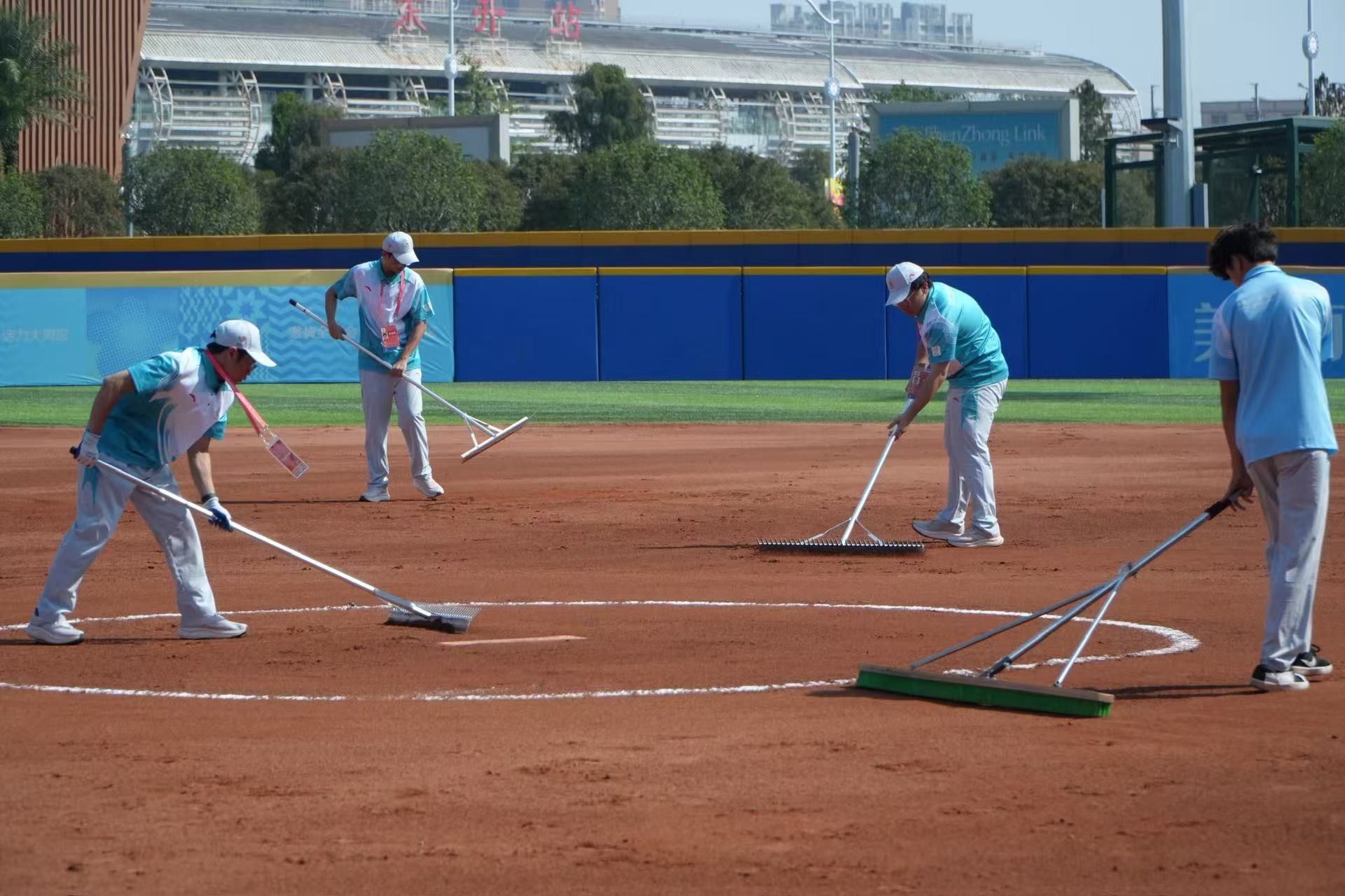 观众从入场开始,票务组志愿者已开始忙碌:打票、验票、答疑、引导……遇到有老人家不清楚如何买票,志愿者一步步指引其用手机操作,直至顺利购票。无线电安检组志愿者提醒观众放包安检,存放禁带物品。在东门入口,场院安保组志愿者不厌其烦地提醒:“观看垒球赛请往左走,观看棒球赛请往右走。”类似的话语,一天下来可能要反复讲几百次,但他们依然不失耐心和微笑。