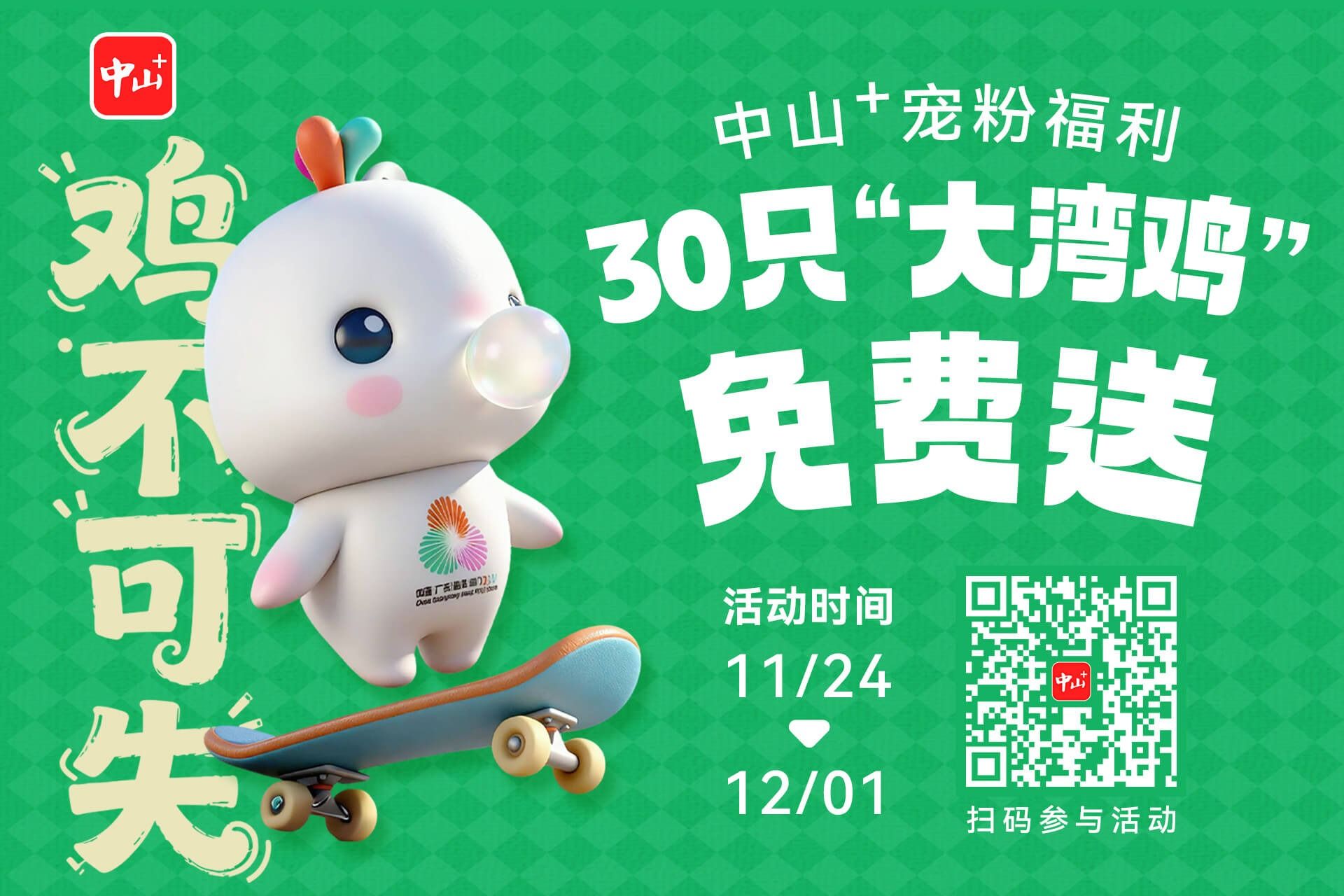 活动结束后,“中山+”将随机抽取30人,每人送出1只“大湾鸡”。获奖结果将于12月1日17:00后在本条推文公布结果,并通过短信方式通知中奖者。参与活动时,请务必留下正确的电话号码。