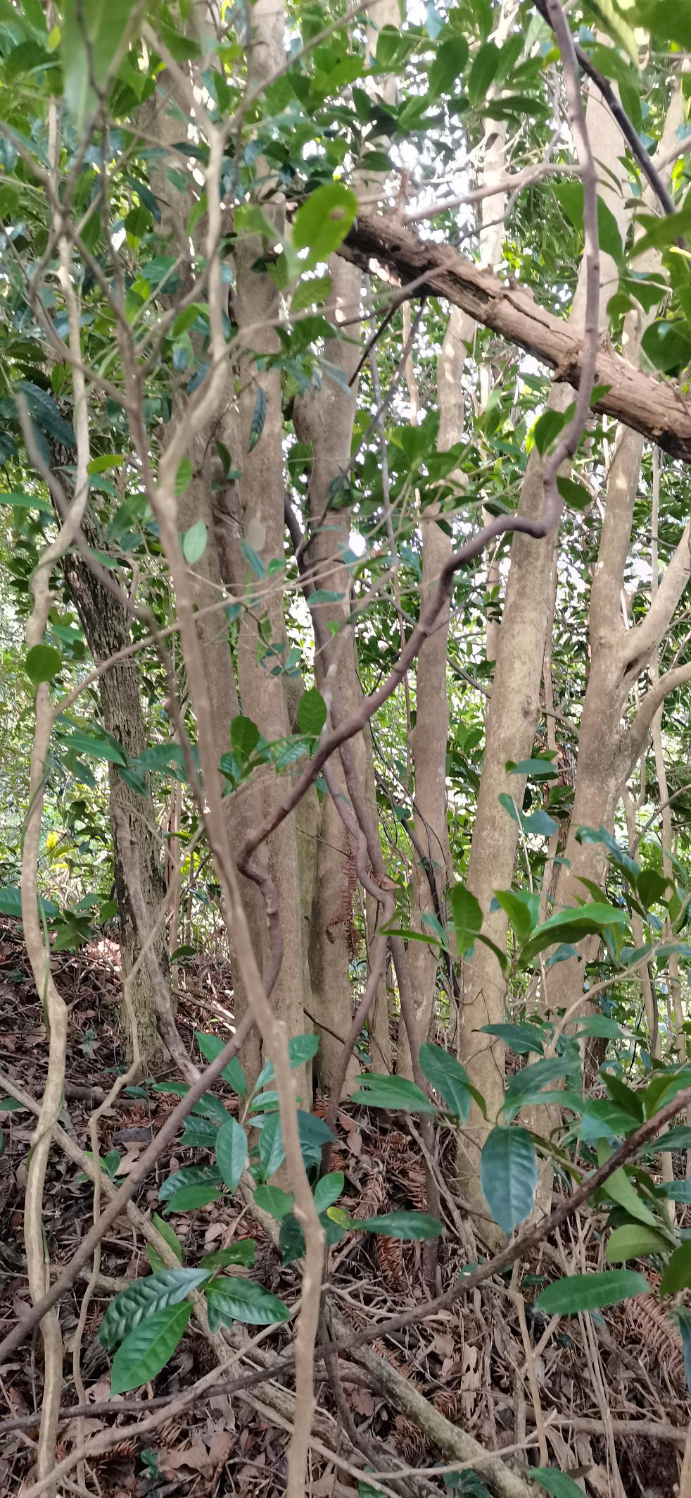 今年9月,市自然保护地管护中心与华南国家植物园联合开展野外调查时,在广东中山香山省级自然保护区(以下简称“香山保护区”)发现一株山茶科大乔木“普洱茶”,是我市野生植物分布新记录物种。当时发现的野生普洱茶植株仅有1株,管护中心技术人员根据植物种群分布特性推断可能还有植株分布。经过2个月的摸排调查,在香山保护区范围再次发现野生普洱茶植株,本次发现的普洱茶有两株丛生大树,长势良好,旁边有近百株小苗已萌发。