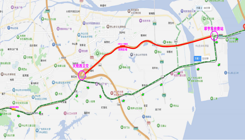 翠亨东收费站出高速路→未来大道→翠亨快线→南阳山隧道→ 火炬西立交→中山城东收费站进入→中阳高速。