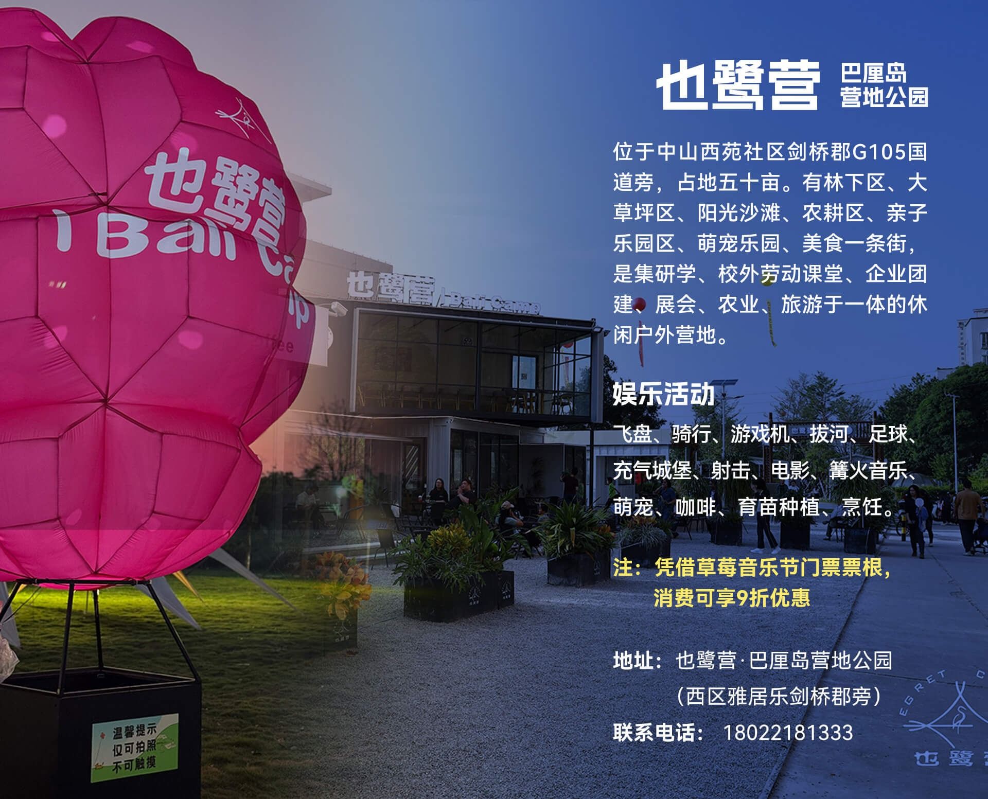 1.一等奖2名:每人获得1张12月28日中山草莓音乐节单日门票+西区也鹭营·巴厘岛营地公园四人烤肉套餐1份+石岐街道金鹰公馆享寓高级大床房免费试住1晚(12月27日晚);