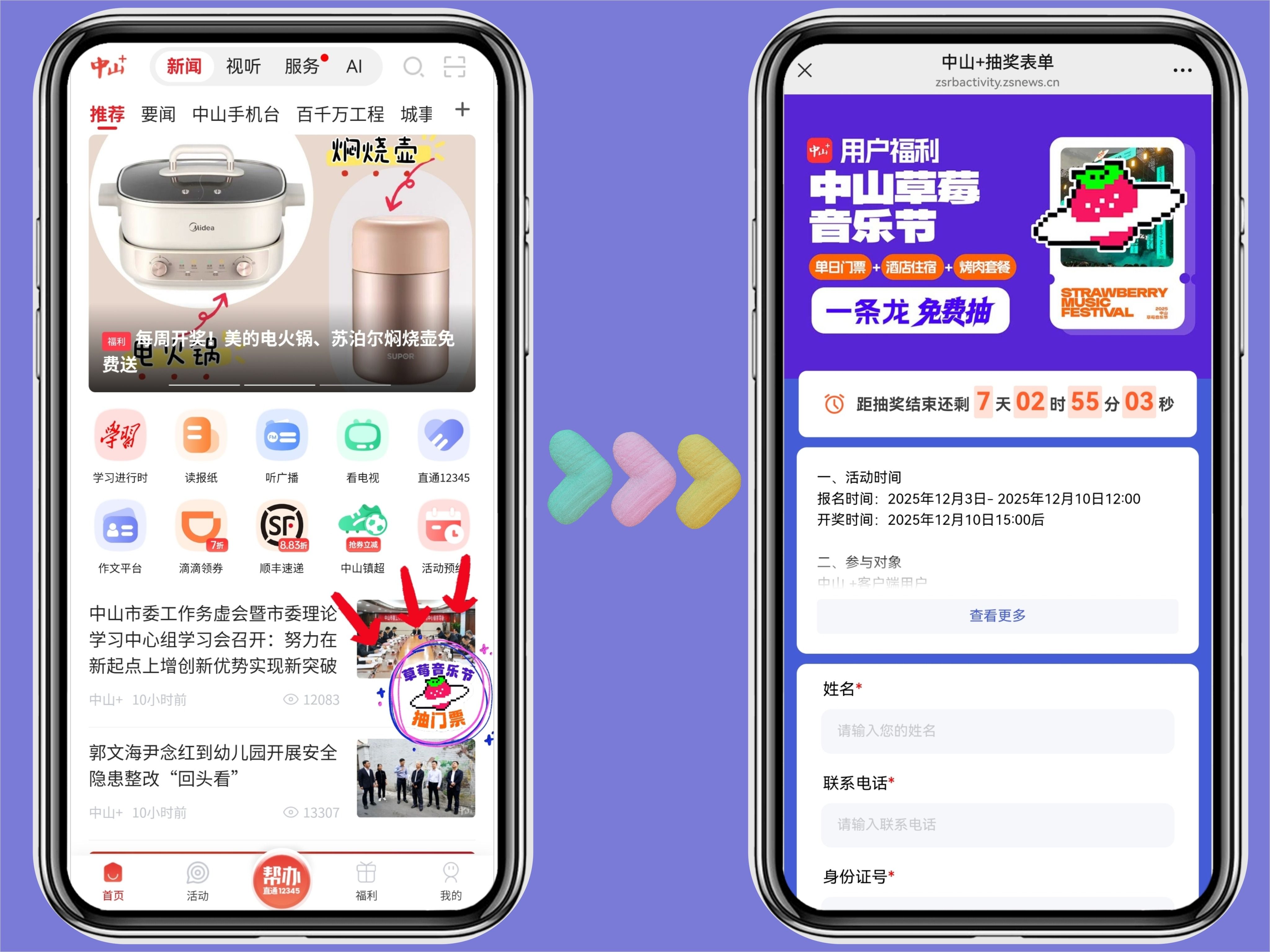 2.打开“中山+”客户端,进入新闻首页,点击右下侧「草莓音乐节门票抽奖」浮标去填写信息,等待开奖(所填写信息需与兑票时实名信息一致)。