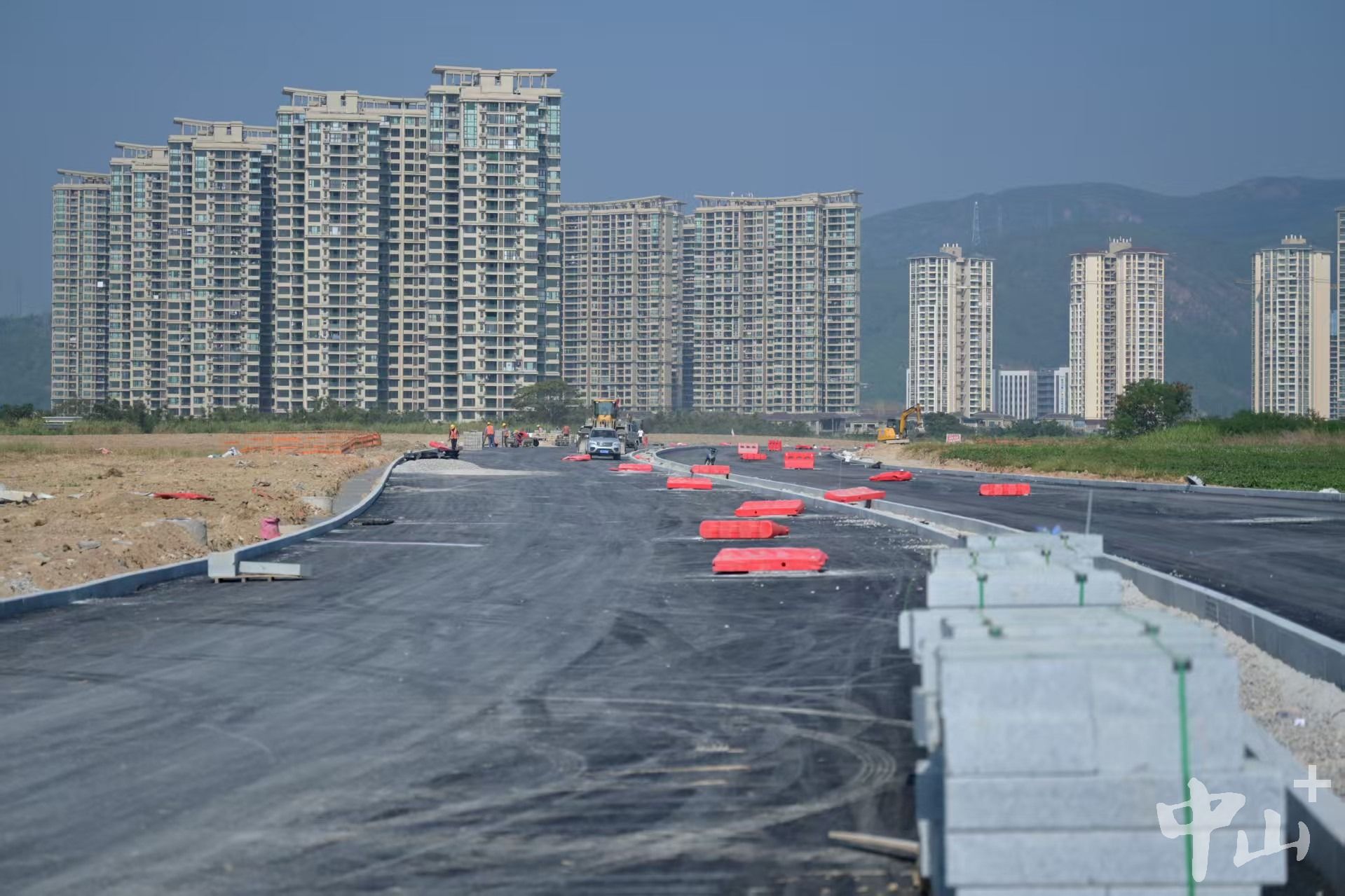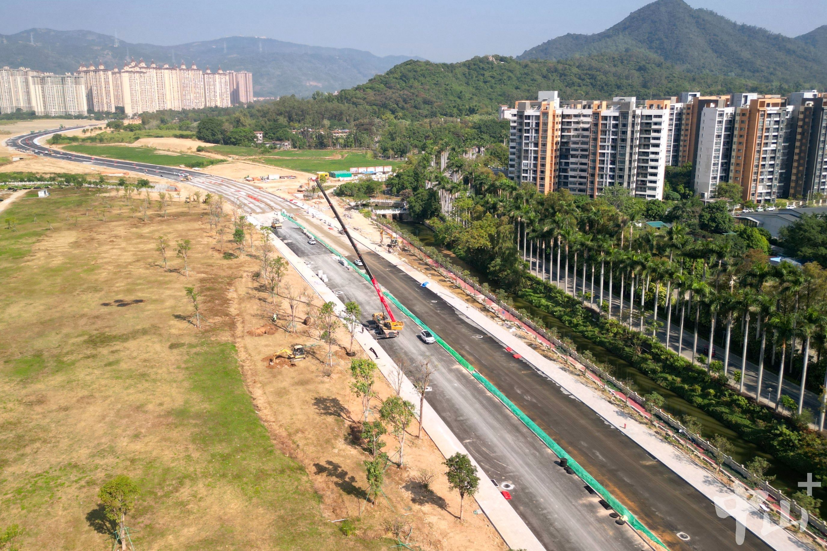 上午10时,紧邻中山温泉的登贤路建设现场如火如荼,施工人员正在进行最后一层水稳层养护作业。只见工人细心地用土工布覆盖路面,再持水管均匀洒水进行养护,确保路基强度符合标准。顺着施工路段远眺,登贤路往五桂山方向的御龙山住宅区已清晰可见,这条交通要道的轮廓正逐步成型。