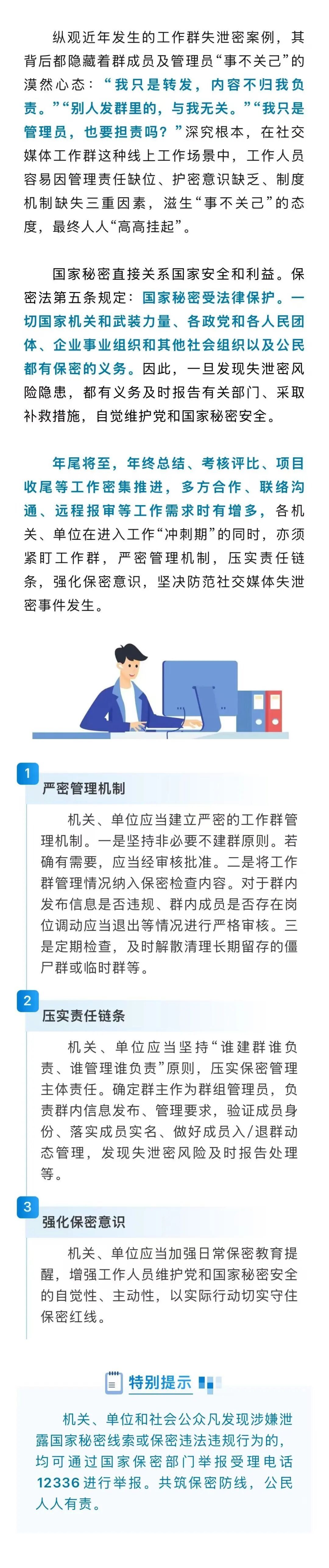 据“保密观”微信公众号12月18日消息,近年来,以微信、QQ、钉钉等为代表的社交媒体以其功能实用、操作便捷等特性在工作场景中得到广泛应用。随之而来的,工作群处理公务导致的失泄密案件也时有发生,已成为社交媒体失泄密案件的“高发地”。某单位工作人员吕某因疏忽大意在工作群中发布国家秘密信息,先后被3个微信群转发。而这3个群中近百名同事,竟没有一人出面提醒制止,漠视国家秘密信息全面扩散。最终,吕某及3个微信群管理员均被追究相应责任。