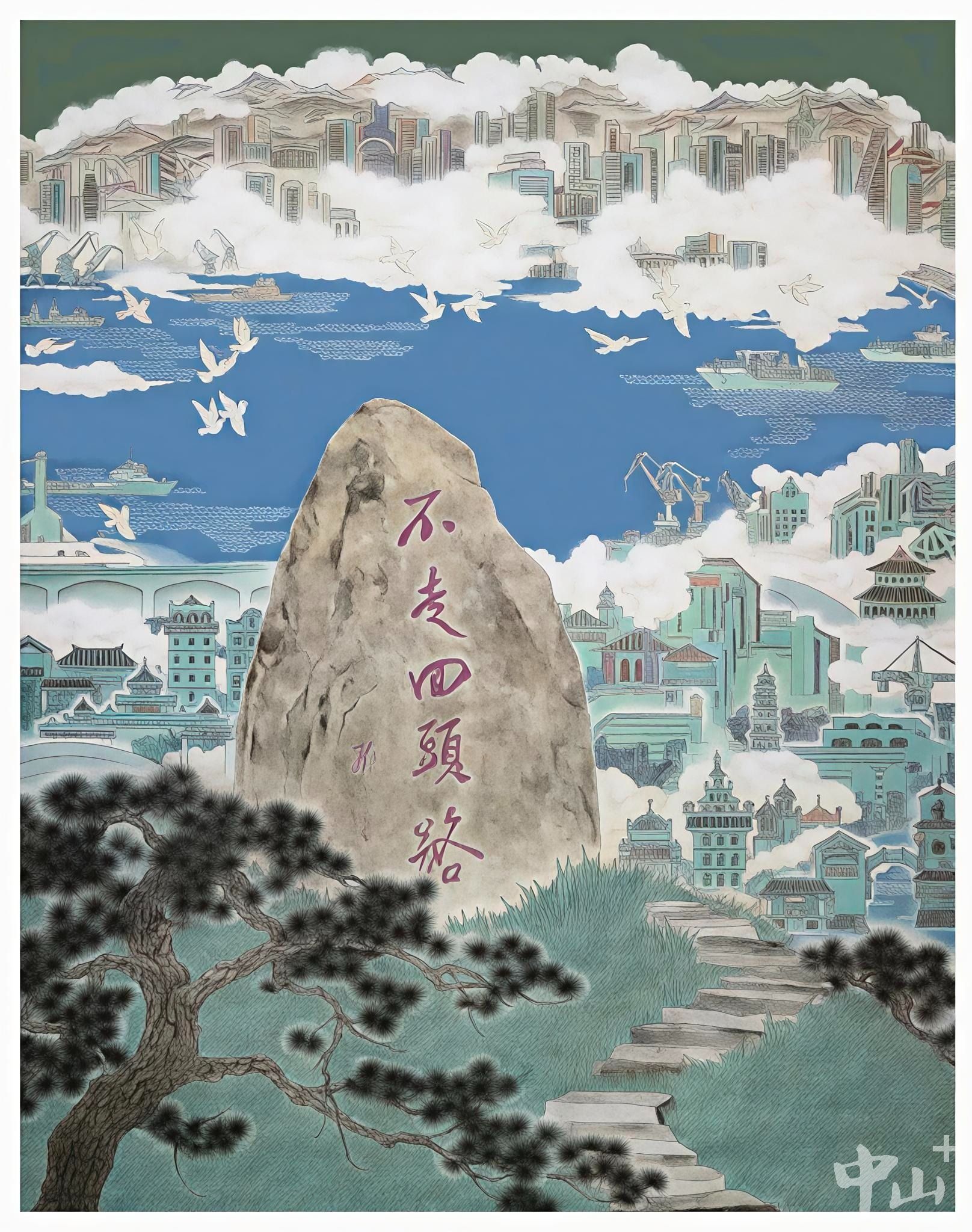肖伟的壁画《不走回头路》(276×206厘米),采用装饰性与概括性兼具的艺术手法,勾勒出波澜壮阔的时代变迁。画面中,珠江口岸的碉楼、民房等近代景物渐次过渡为高楼、高铁等现代景致,烟云缭绕间白鸽翩飞,既精准定格了1984年邓小平视察中山罗三妹山时“不走回头路”的历史强音,更深刻寓意改革开放是国家腾飞的必由之路,让抽象的改革精神在笔墨时空对话中变得可视化、可感知。