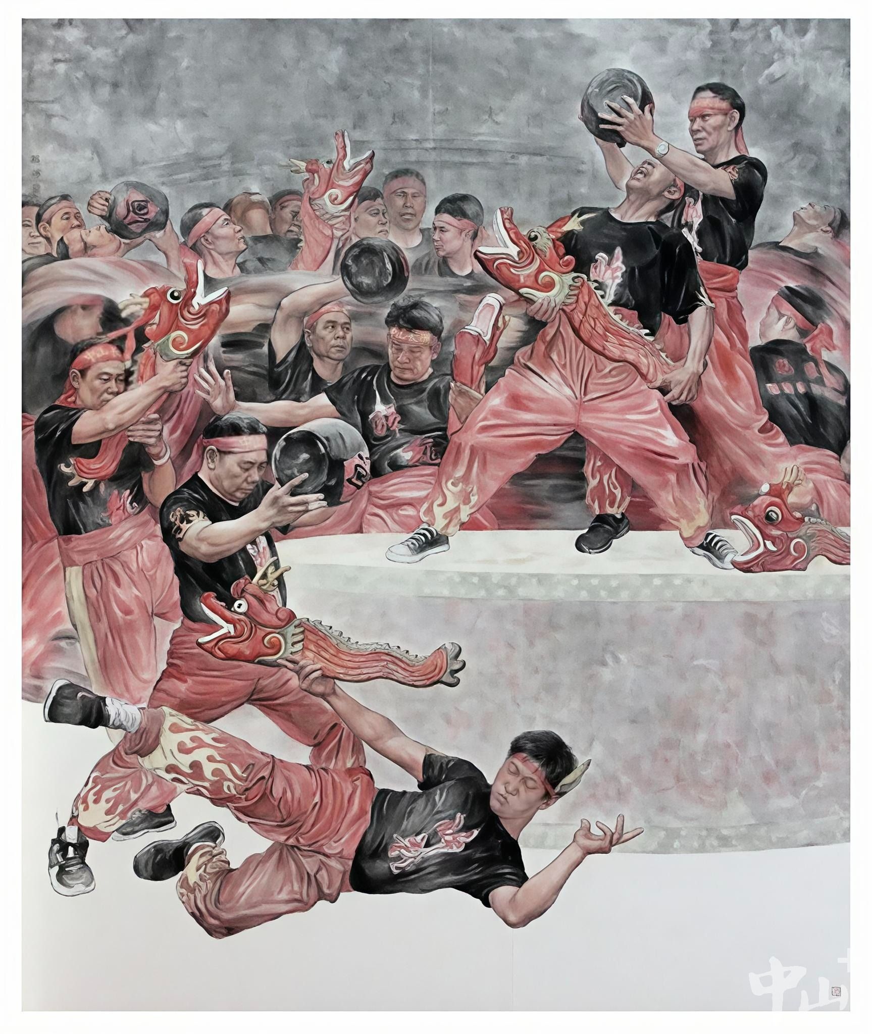 余镇河的中国画《舞醉龙贺湾区》(240×200厘米)另辟蹊径,以国家级非物质文化遗产岭南醉龙舞巡演为创作原型。作品捕捉舞者“形醉意不醉”的各异动态、鲜活表情与热烈氛围,将广府文化中敢闯敢试的创新精神具象化,让传统民俗在笔墨间迸发蓬勃时代活力,成为大湾区蓬勃发展的生动艺术注脚。