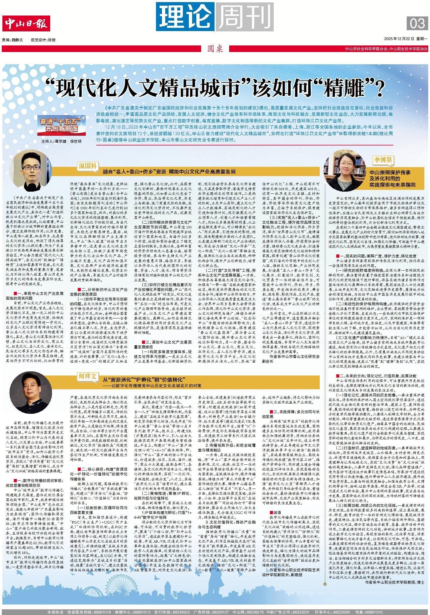 12月18日,2025年中山市“百千万工程”环五桂山农文旅招商推介会举行。大会吸引了来自香港、上海、浙江等全国各地的企业参加。今年以来,全市累计签约农文旅项目72个,总投资额超130亿元。中山正奋力建设“现代化人文精品城市”,如何在打造“环珠江口文化产业带”中取得新突破?本期《理论周刊·圆桌》邀请中山职业技术学院、中山市香山文化研究会专家进行探讨。